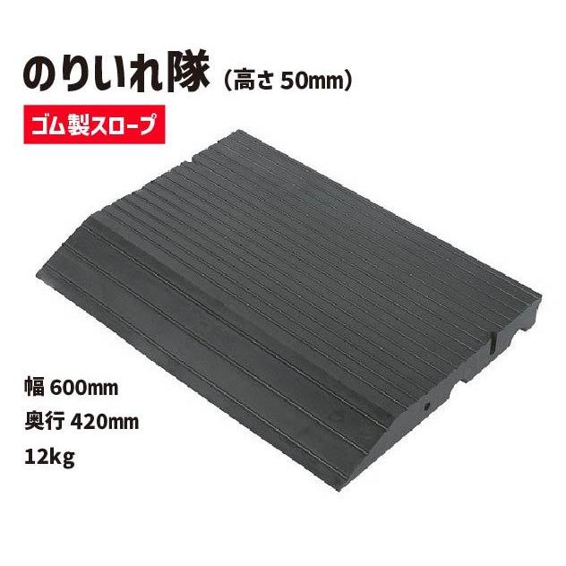 50mm前後の高さの段差に! 段差解消スロープ「のりいれ隊」・ 10トン車乗り入れ可能 ゴム製なので、樹脂製に比べて耐久性抜群。・通行時の音が静か ゴム製は音鳴りも非常に少なく、騒音防止に。・ 滑りにくい形状 表面に溝加工を施してあり、自動車やバイクでも安心。幅600mm × 奥行420mm × 高さ50mm重量: 12kg