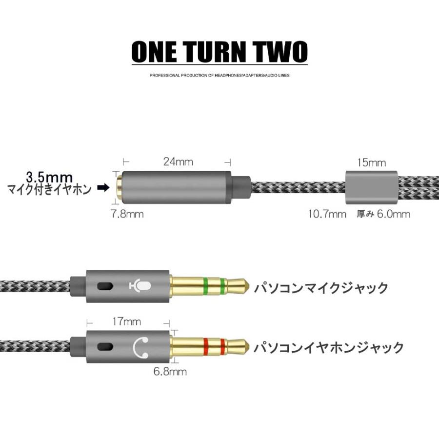 スマホやタブレットに付いている 4極のプラグをマイク(3極ジャック)とイヤホン(3極ジャック)に分岐させて、3.5mmステレオミニジャック(マイク入力・ヘッドホン出力)を持つパソコンに接続できるイヤホンマイク変換ケーブルです。