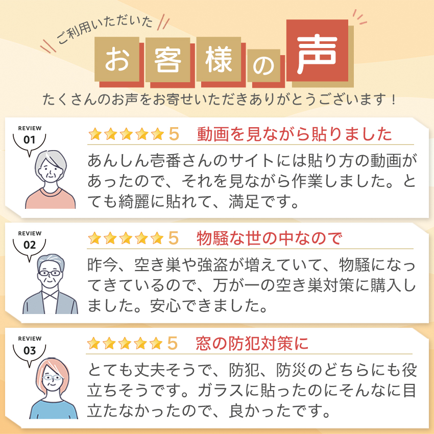 窓ガラスを割りにくくし、ガラス破りからの侵入を防止する防犯フィルムです。窓ガラスや玄関ドアのガラスなど、侵入されやすい場所へ貼ってください。 防犯性の高い建物部品と認定された製品に付けられるのが「CPマーク」ですがこちらの商品はCP認定された防犯フィルムです。 防犯対策のステッカー付きなので、より防犯性をアップさせることができます。取付施工も比較的簡単で、貼り方の動画もありますので、ご安心ください。解説動画にもあるように綺麗にはがせるので賃貸マンションにもおすすめです。防犯シートは無色透明で目立ちにくいのも特徴です。また、防犯ガラスフィルムは侵入を防ぐだけでなく、災害時や台風などのガラス飛散防止にも役立ちます。取付の際に便利なヘラ付き!