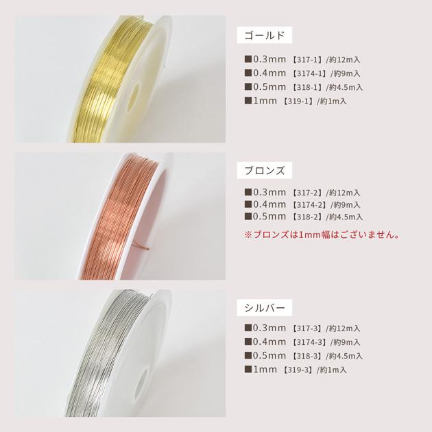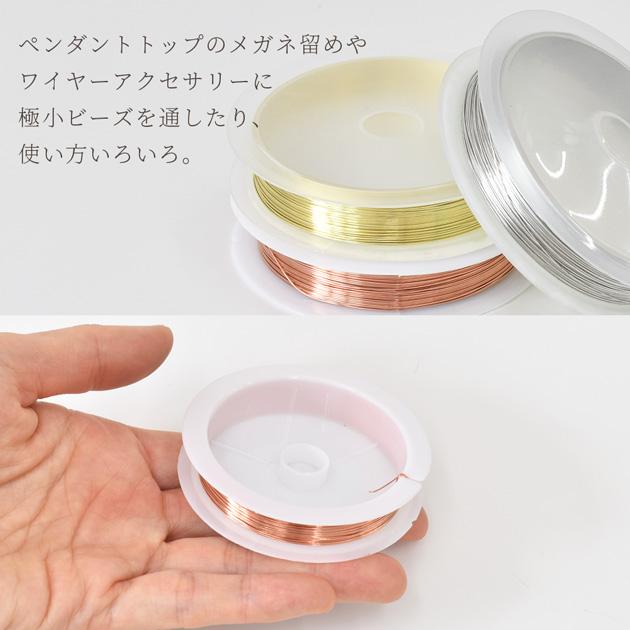 銅製ワイヤー 全4サイズゴールド/ブロンズ/シルバー#ゆうパケ24点可アクセサリー作りに大活躍のワイヤーワイヤーワークを始め、極小ビーズをたくさん通した作品やビジューや天然石などのペンダントトップやイヤリング・ピアスのパーツをめがね留めにしたり・・・レジンとワイヤーでディップアートにもオススメです。作る作品に合わせた太さや色をお選びいただけます。