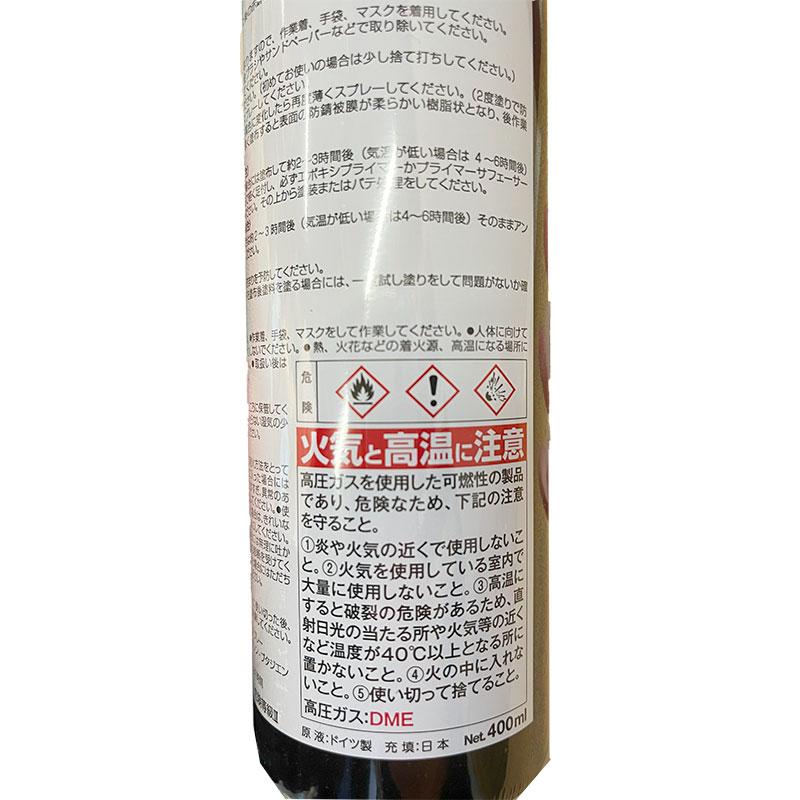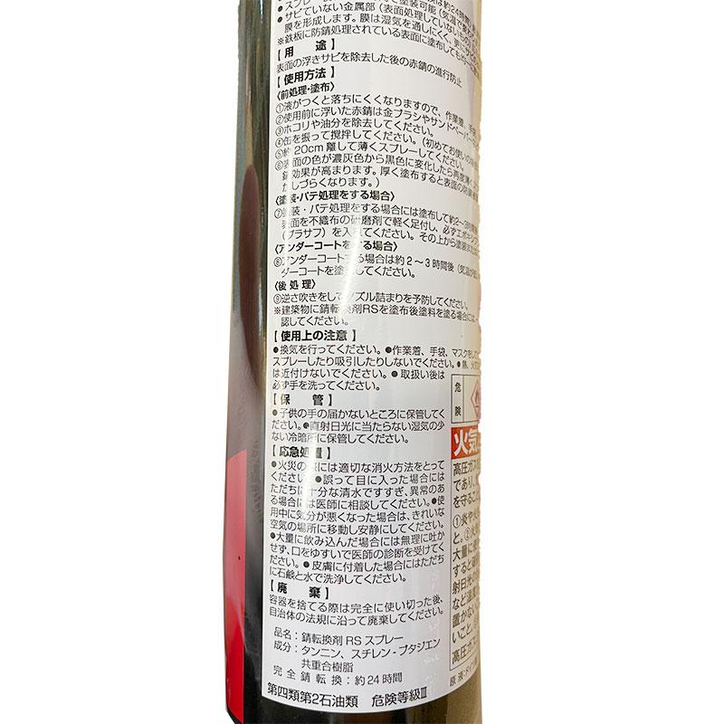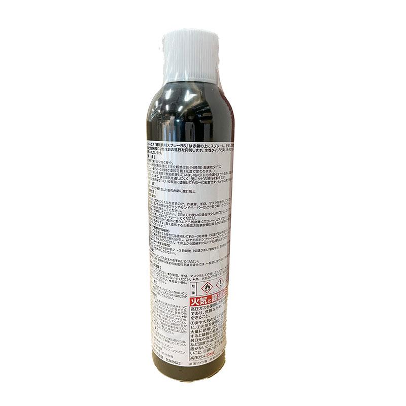 ・水溶性で溶剤臭が少ない。・赤錆を黒錆状に転換+表面に防錆塗膜を形成するダブル効果!約1時間で表面皮膜が乾燥するので塗布後1〜2時間でサフェーサー塗布後、塗装可能です。パテも塗装と同様にサフェーサーを入れてから塗布できます。(一部のパテは密着が悪い場合があります)。1本で1.5〜3m2塗布できます。用途・自動車の金属部の赤錆に使用し再発予防・建築等の金属部の赤錆の持続的な防錆効果仕様色:黒タイプ:スプレー容量:400ml