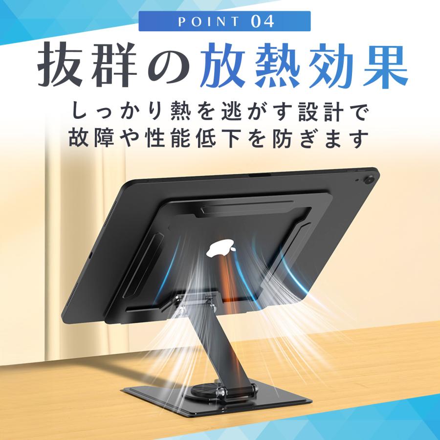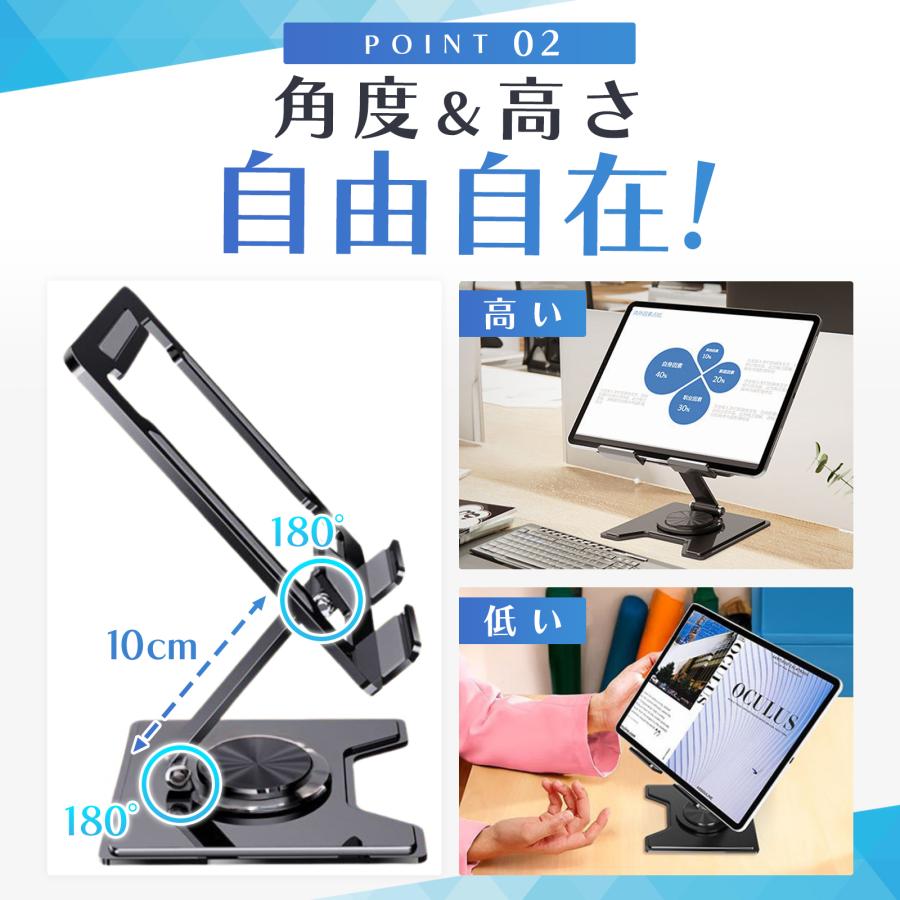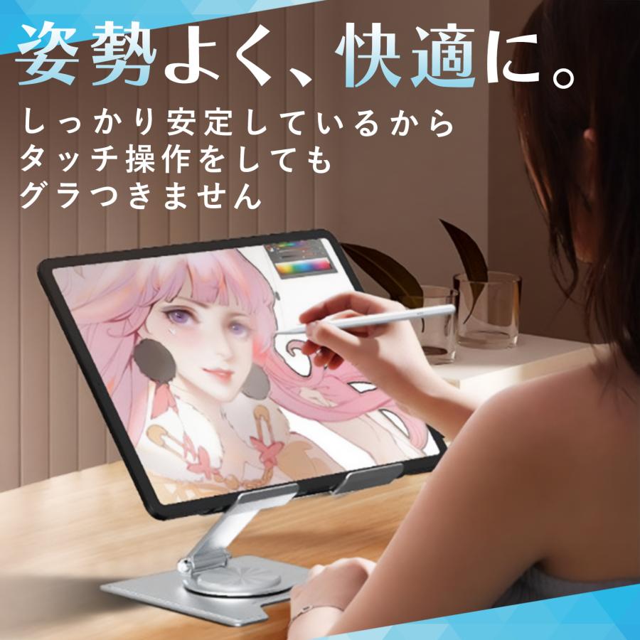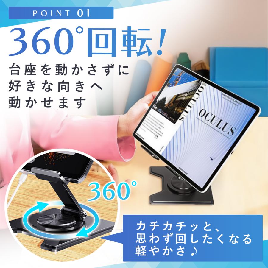 360°回転可能な台座付き、自由に端末の向きを調整できる新型のタブレットスタンドです。