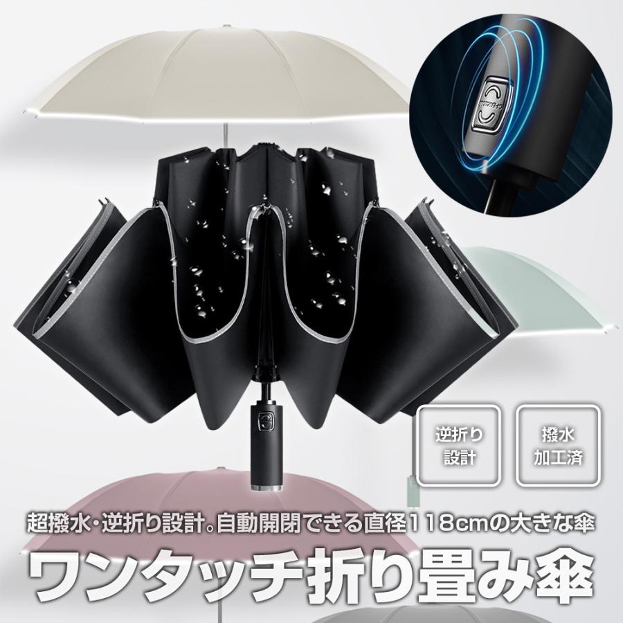超撥水・逆折り設計。自動開閉できる直径118cmの大きな傘。ワンタッチ折りたたみ傘です。