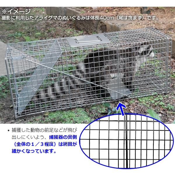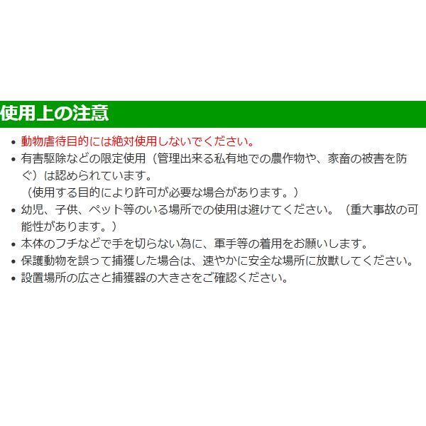 (どのタイプの捕獲器でも、捕獲した動物が中で暴れケガをする恐れはあります。取り扱いにご注意ください。)