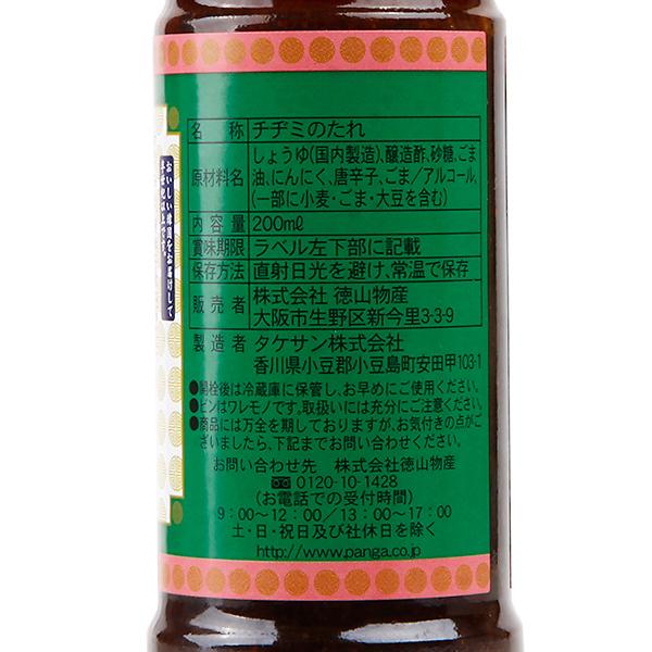 名称 チヂミのたれ原材料名 醤油、醸造酢、砂糖、ごま油、にんにく、唐辛子、ごま、アルコール(原材料の一部に小麦、ごま、大豆を含む)内容量 200ml賞味期限 別途記載保存方法 直射日光、高温多湿をさけて保存してください。製造者 タケサン株式会社香川県小豆郡小豆島町安田甲103-1特徴 甘さ、辛さ、酸味を兼ね備えた、醤油味のタレです。注意 ※パッケージデザインは予告なく変更になる場合がございますので、予めご了承ください。