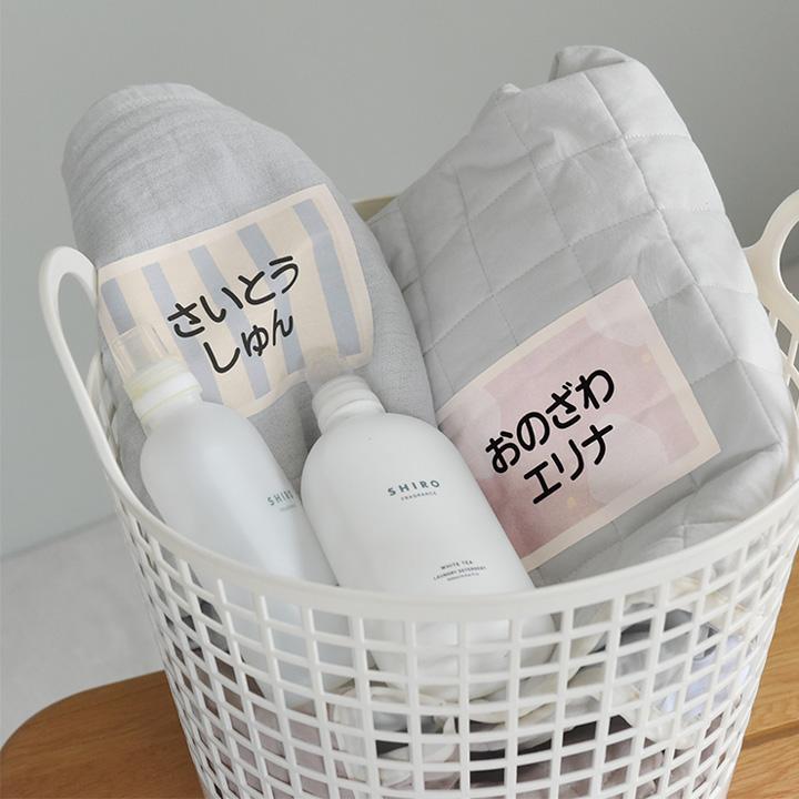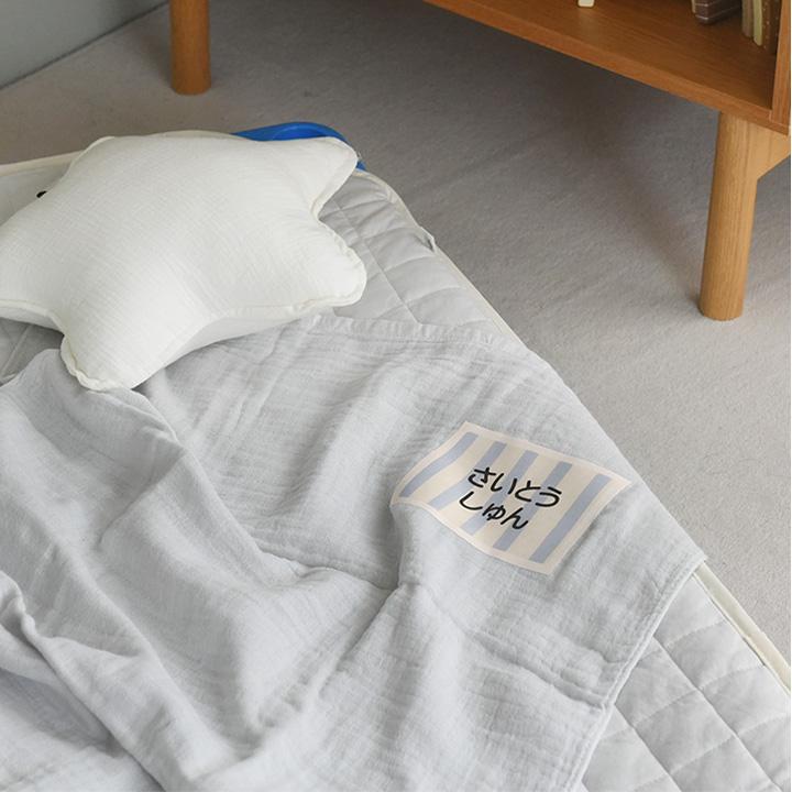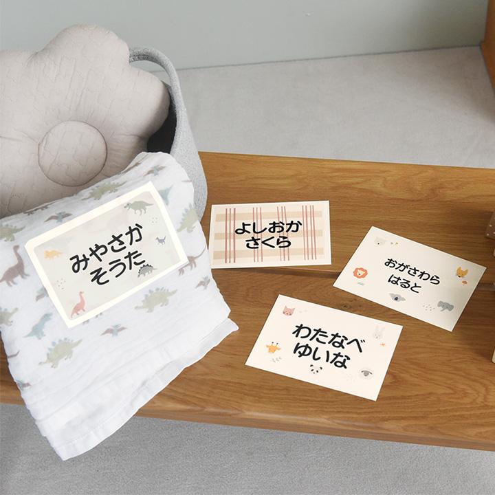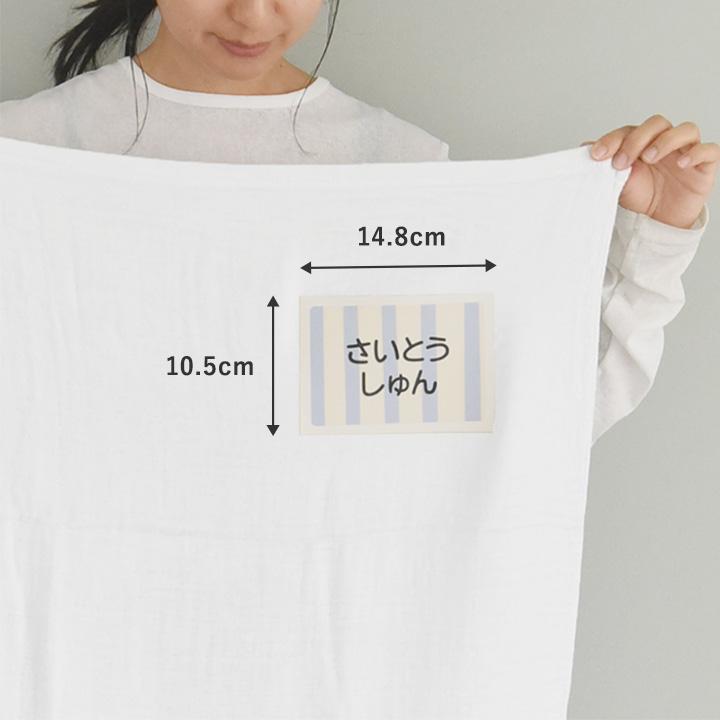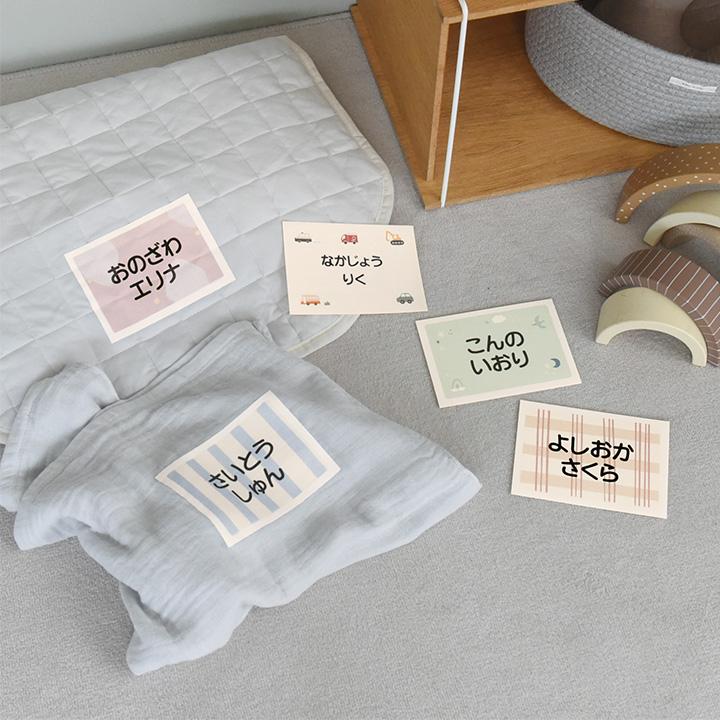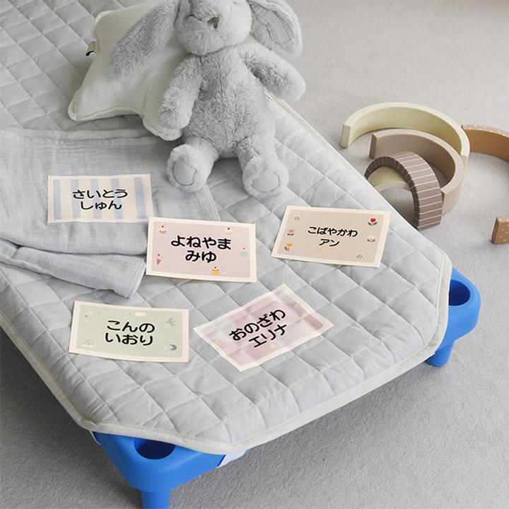 保育園でのお昼寝タイムに使う、子どものお布団やタオルケットに、アイロンで簡単に貼れる大判のお名前シートです。大きなサイズで名前も見やすく、カワイすぎない北欧風の色使いも◎
