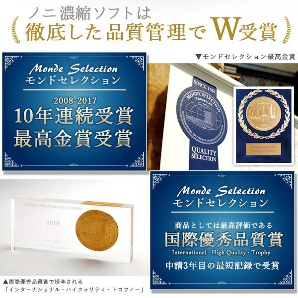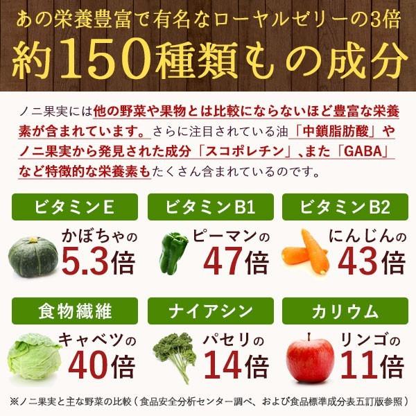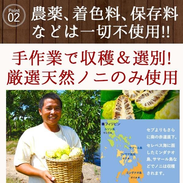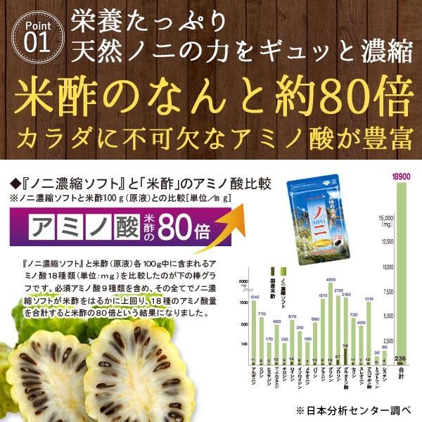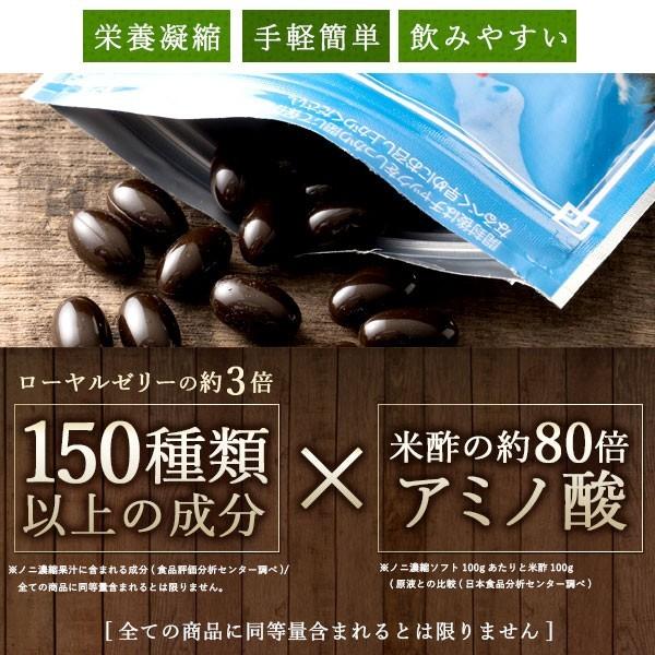 ノニジュースをより手軽に飲みたい方やノニのクセが強くて苦手という方にオススメなのが「ノニ濃縮ソフト」です。ノニの有用成分をクセなく飲みやすい小さなソフトカプセルに濃縮。 ノニ濃縮ソフトで厳選しているノニは、セブ島近くに位置するミンダナオ島やサマール島のノニ果実。ハワイアンノニやタヒチアンノニよりも赤道に近い場所で育つノニは、より大きな実になることに注目。過酷な環境下で育つ天然ノニは農薬を一切使用しません。ひとつひとつ人間の手で丁寧にノニを摘みます。ノニ果実はすぐに洗浄、熟成発酵し、お届けしております。 国内の健康食品GMP認証工場で製造。ノニ濃縮ソフトは徹底した品質管理が認められ、モンドセレクション最高金賞を受賞。さらに最高評価である国際優秀品質賞も受賞しています。 ノニは各種ビタミン・ミネラル類、食物繊維、アミノ酸、さらには話題のノニ酵素など、その数はローヤルゼリーの約3倍。約150種類以上もの有用成分を手軽に摂ることができるのが特徴です。なかでも注目されるのがアミノ酸含有量。その含有量は米酢の約80倍。カプセルタイプですので、いつでもお飲みいただけるのがノニ濃縮ソフトの特徴です。