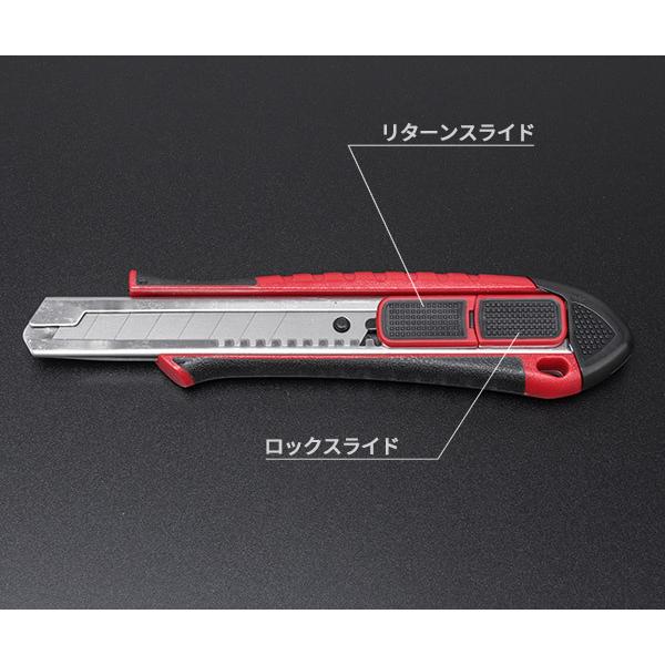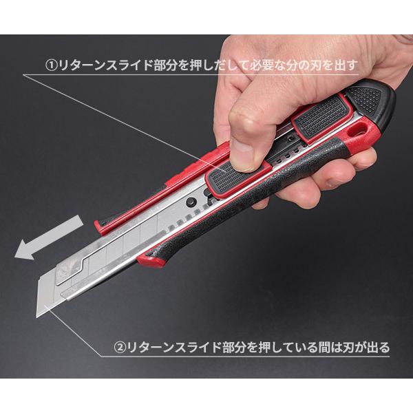 リターンスライド部分から指を離すと自動的に刃が収納位置に戻る機構を備えており、刃の戻し忘れ等を防ぎ事故を防止します。