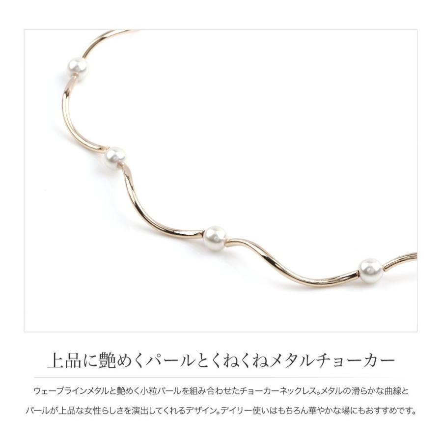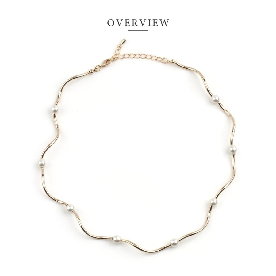 ウェーブラインメタルと艶めく小粒パールを組み合わせたチョーカーネックレス。メタルの滑らかな曲線とパールが上品な女性らしさを演出してくれるデザイン。デイリー使いはもちろん華やかな場にもおすすめです。■サイズチェーン長さ 34.5cmアジャスター長さ 6.5cm重さ 6.2g■素材合金 フェイクパール