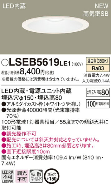 ●天井埋込型、埋込穴φ150、浅型8H・高気密SB形・拡散タイプ(マイルド配光)