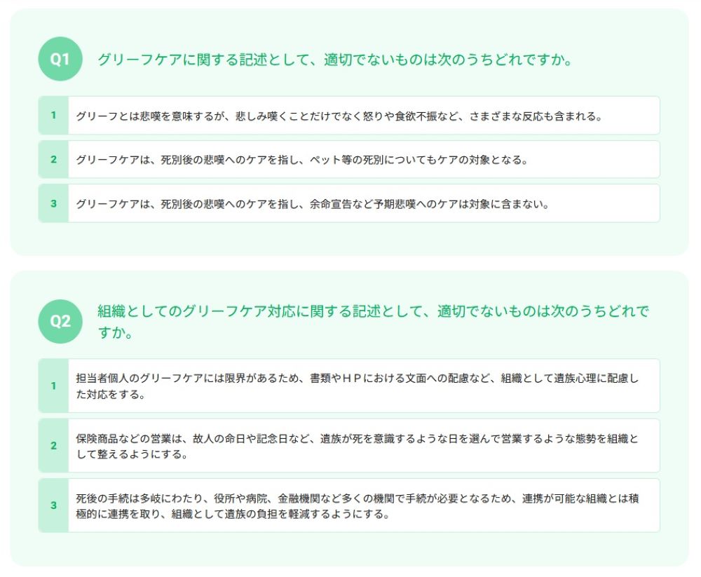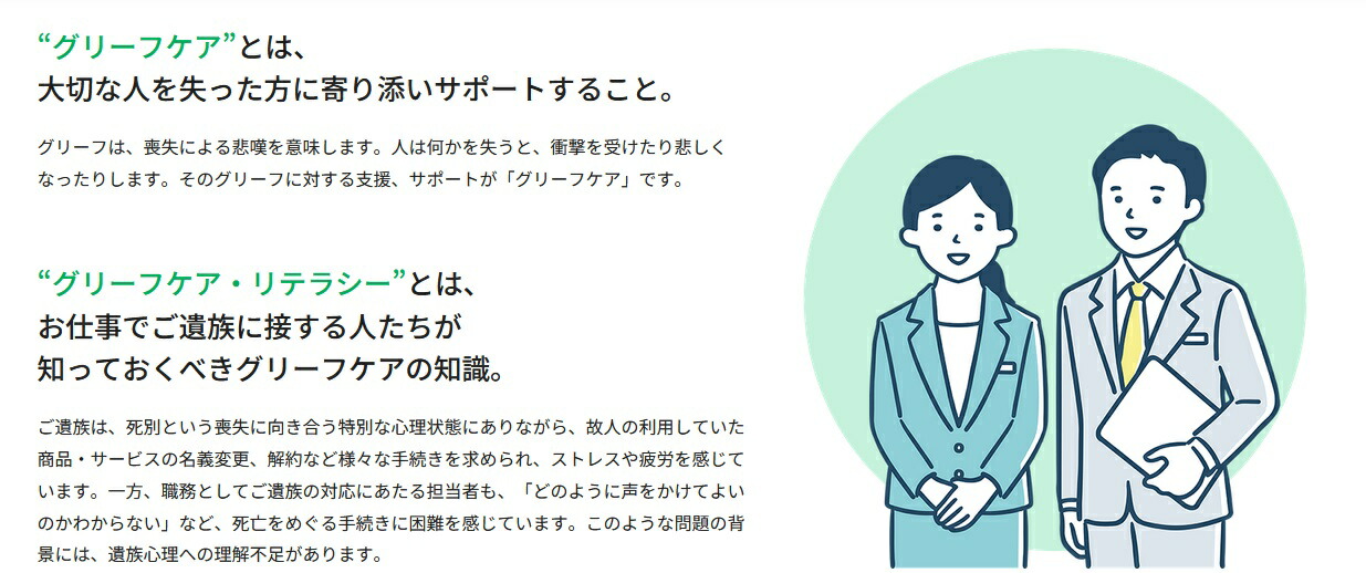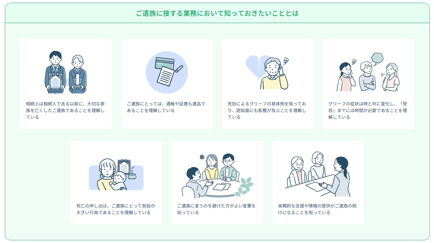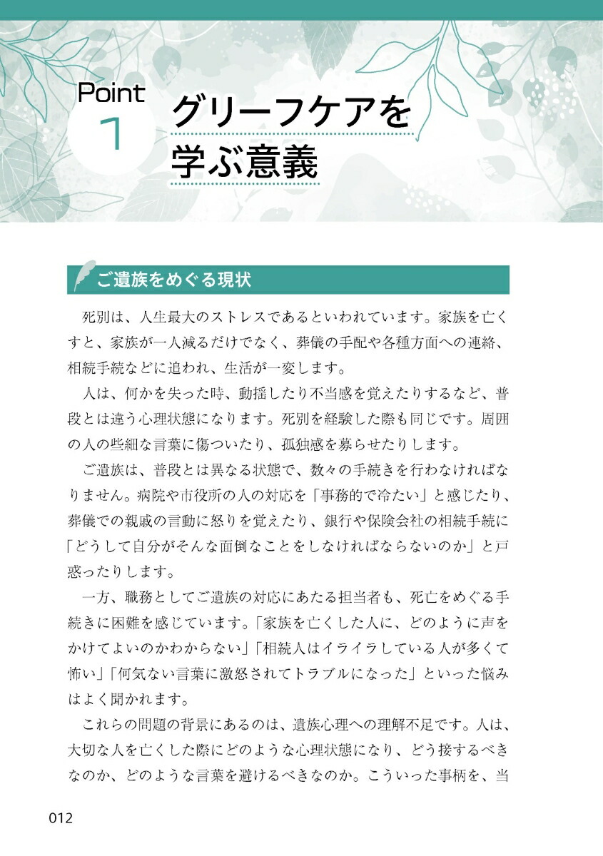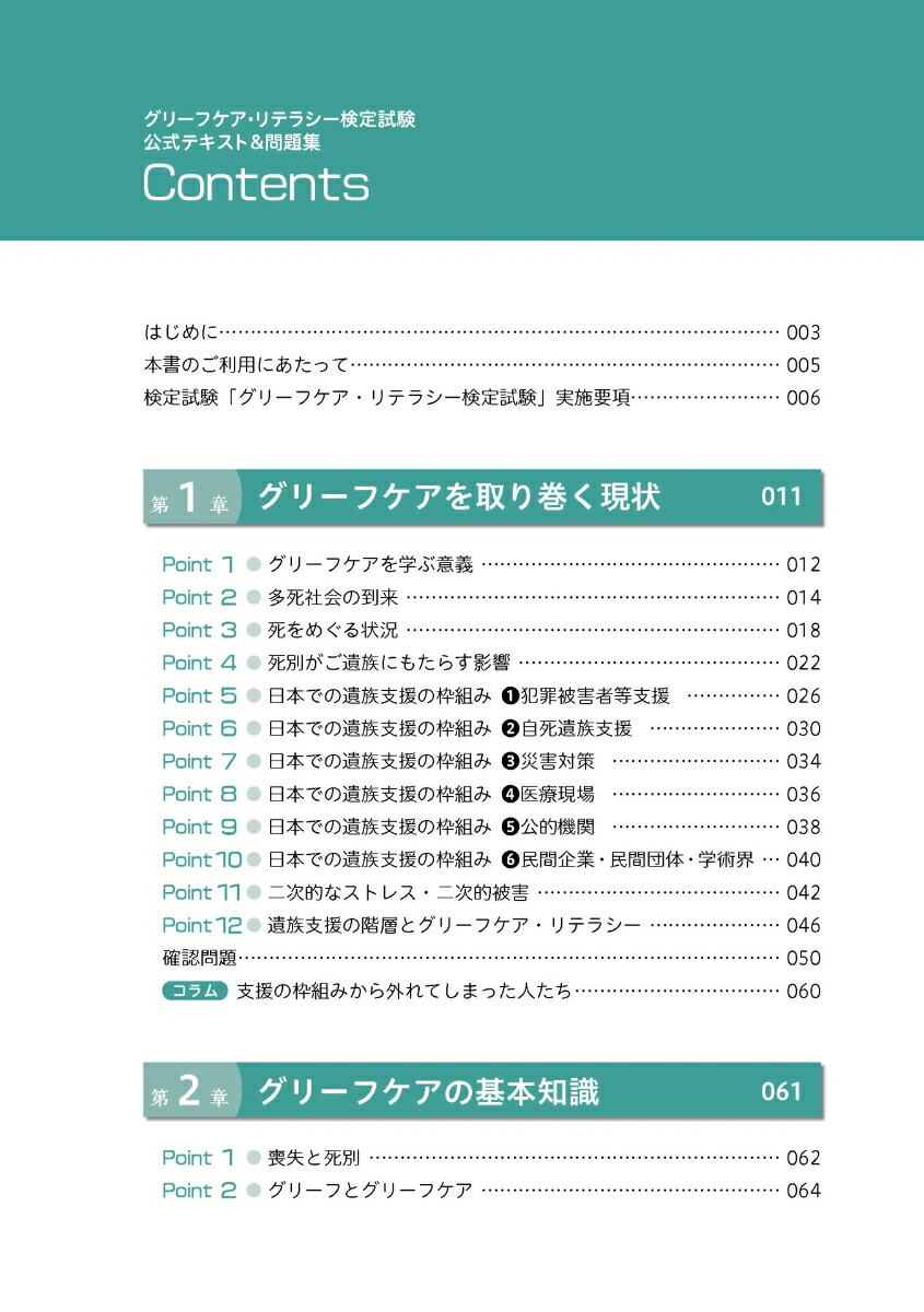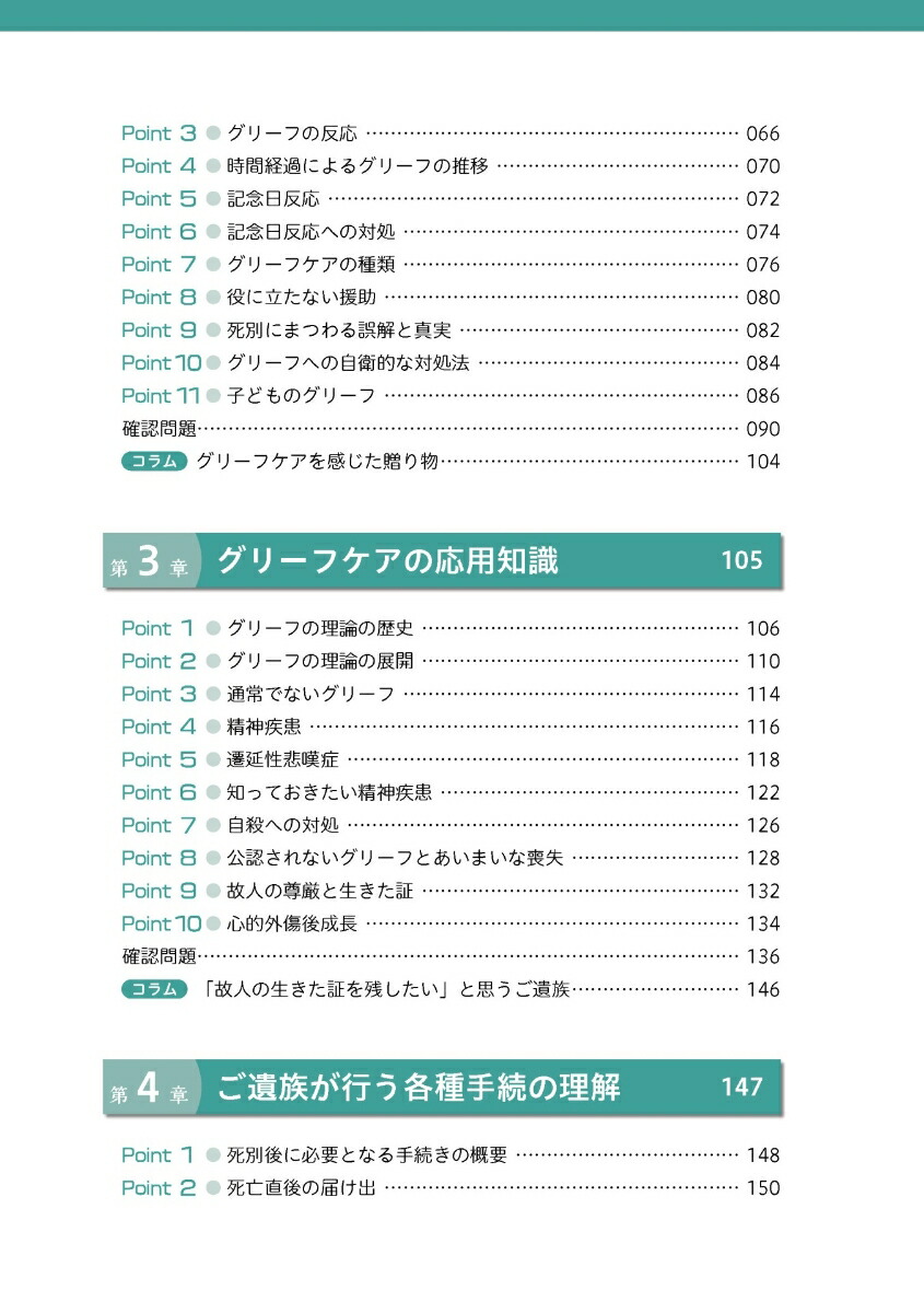 第1章 グリーフケアを取り巻く現状/第2章 グリーフケアの基本知識/第3章 グリーフケアの応用知識/第4章 ご遺族が行う各種手続の理解/第5章 ご遺族に接する際の留意点/第6章 組織としての取組み