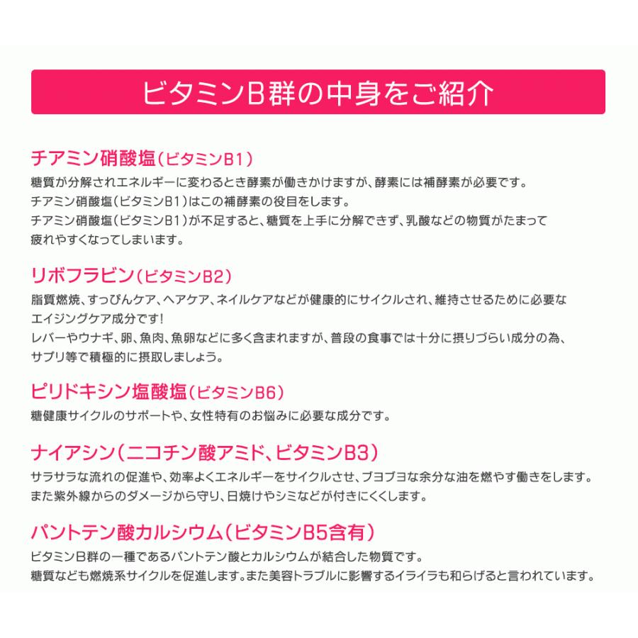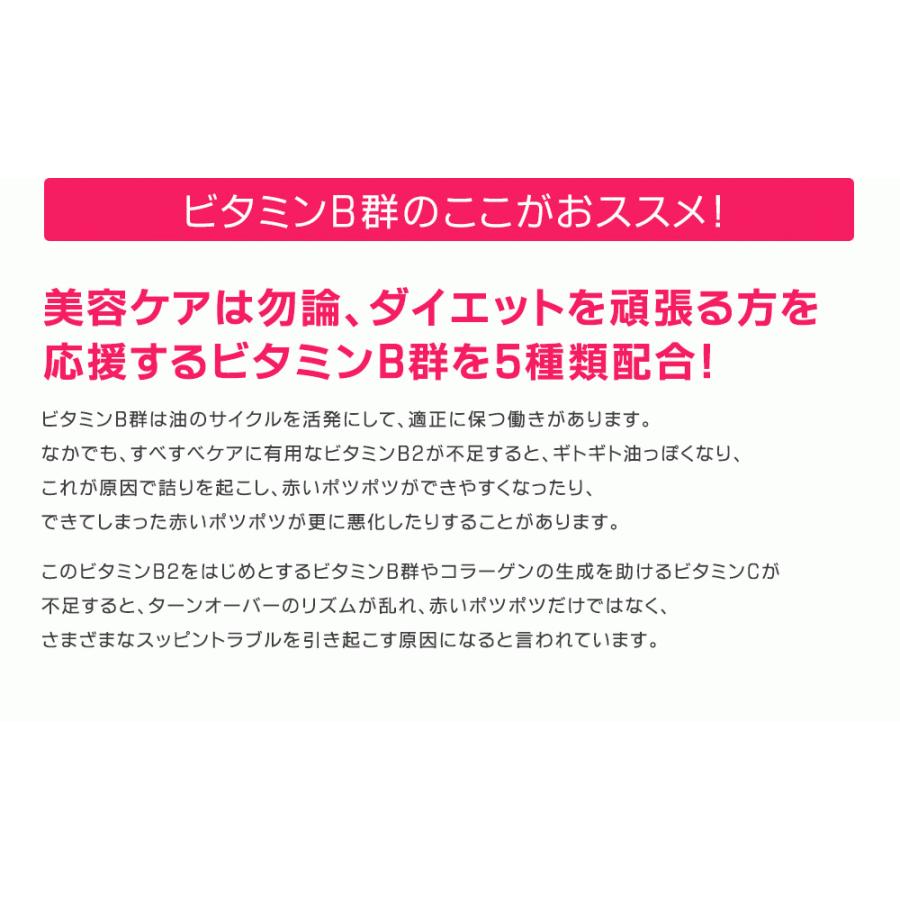 1粒あたりの主要成分・リボフラビン/15mg(ビタミンB2)・チアミン硝酸塩/5mg(ビタミンB1)・ピリドキシン塩酸塩/10mg(ビタミンB6)・パントテン酸カルシウム/10mg・ナイアシン/5mg(ビタミンB3)・ビタミンC/5mg・ビタミンE/3mg・ビタミンA/0.5mg(ビタミンA30%規格品)