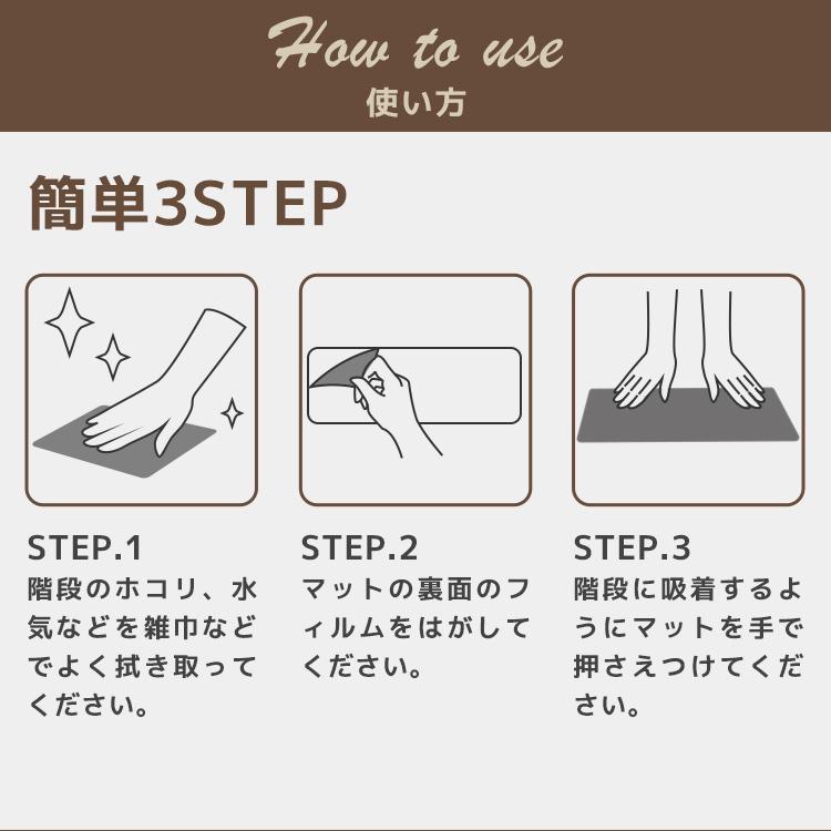 [送料無料]階段に置くだけでぴったりと吸着し、何度でも貼ってはがせる階段マットです。ズレ防止加工済み、クッション性もあり!冬場の階段の冷え防止にも。滑りやすい階段は転倒の危険性もあり、お年寄りや小さいお子さまの転倒対策に。手洗いまたは洗濯機で丸洗いできるのでお手入れ簡単★●仕様カラー:ブラウン、ベージュサイズ(約):幅45cm×20cm×厚み0.3mm素材:ポリエスチル