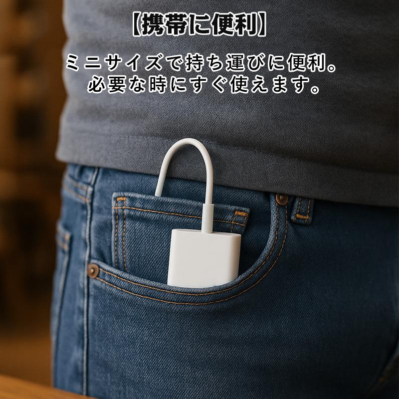 高速データ転送により、デジカメなどで撮った写真などをすぐにiPhoneなどに転送でき、作業の効率もアップします。