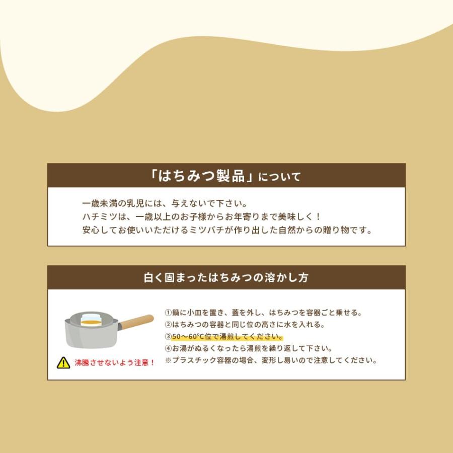 気温の温度差が大きい(特に寒いとき)は、蜂蜜の特性として結晶することがありますが、品質・栄養には変わりありません。一歳未満の乳児には蜂蜜を与えないでください。
