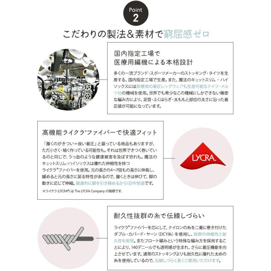 手軽に履ける着圧ストッキングのひざ丈タイプでありながら、段階的な引き締め設計を採用。