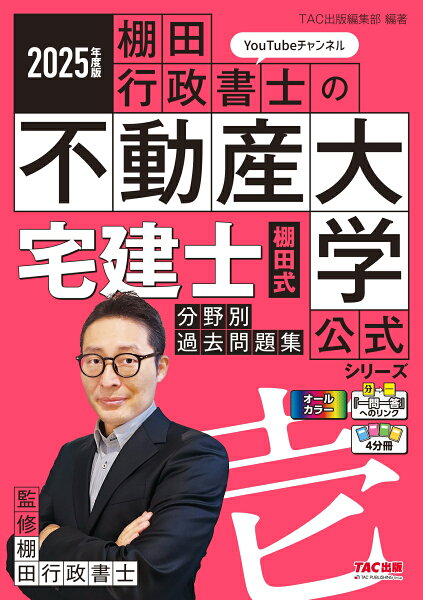登録者数20万人超のYouTubeチャンネル『棚田行政書士の不動産大学』。宅建士試験受験者に絶大な人気を誇る棚田行政書士が、日々の配信で“受験者の生の声”に直接耳を傾けることで見つけた画期的メソッドを監修者として全面注入!!「こんな資格書、あったらいいな」を実現した、すべての宅建士試験受験者の方のための『棚田行政書士の不動産大学』公式教材がついに登場です!《これが「棚田式」!オリジナル合格メソッド》「同じような問題なのになぜだか解けない」『棚田行政書士の不動産大学』に寄せられた最多の悩みがこれです。合格のためには絶対に得点すべき問題なのに、少し角度が変わる、周辺知識が含まれるとお手上げ…。そうしたお悩みも、完全リンクした本シリーズの『分野別』&『一問一答』を繰り返し解くことですっきり解決です!1.基礎固め『宅建士 棚田式分野別過去問題集』で合格に必須の基本的知識を習得↓(全選択肢についたリンクを使って『一問一答』へ)2.実践&応用『宅建士 棚田式一問一答過去問題集』で類題や周辺知識を含んだ問題をマスター↓(1、2を繰り返して記憶を定着)3.本番でどんな問題が出題されても、決して負けない強い力を獲得!《まずはしっかり基礎力養成!『宅建士 棚田式分野別過去問題集』の特長》◆楽しく学べるオールカラー◆厳選過去問300問収録合格に必須の頻出・重要論点を完全カバーしています。◆試験攻略の鍵「宅建業法」をはじめに、難関「民法等」を後に「宅建業法」→「法令上の制限」→「民法等」→「その他関連知識」の順に掲載していますのでスムーズに学習が可能です。◆リズムよく解ける見開き単位問題ごとに重要度キノコつきです。◆1行解説&Step解説解説の冒頭には、ずばり結論がわかる“1行解説”&問題の解き方がみるみるわかる“Step解説”を記載しました。◆全選択肢に『一問一答過去問題集』へのリンク『分野別』→『一問一答』の学習順で効果絶大!◆4分冊形式どこでも手軽に学習可能です。しかも、◆2025年度版『みん欲し』『わかうか』テキストも使えます!『みんなが欲しかった!宅建士の教科書』『わかって合格る宅建士 基本テキスト』への参照リンクつきですので、さらに理解を深めることもできます!!