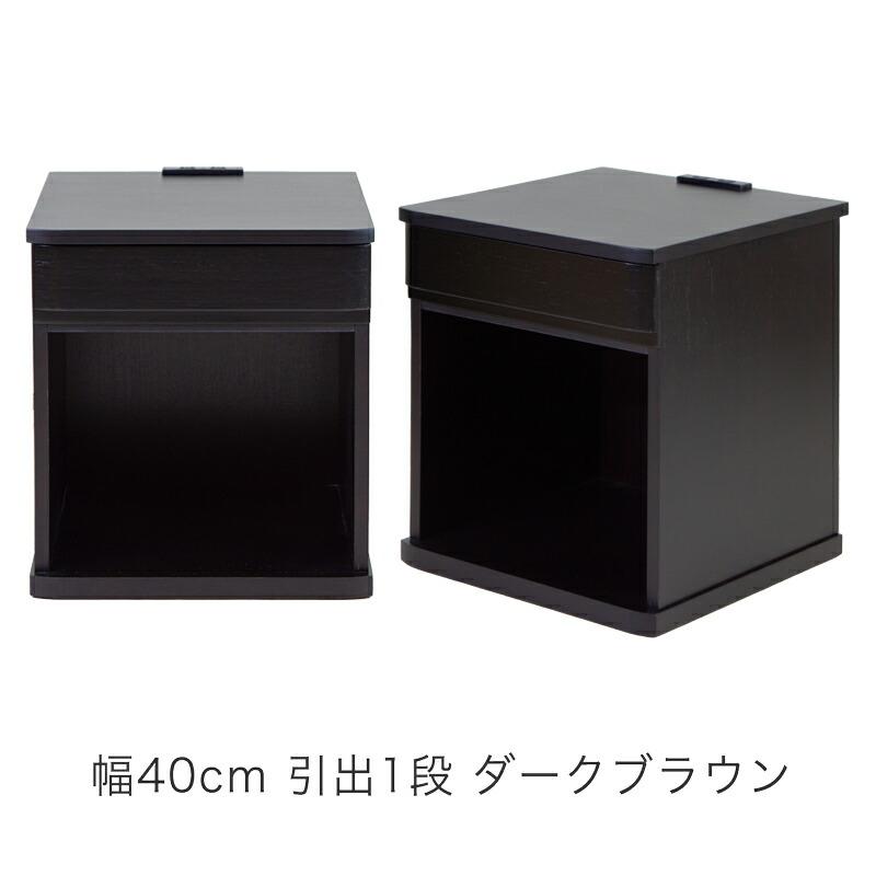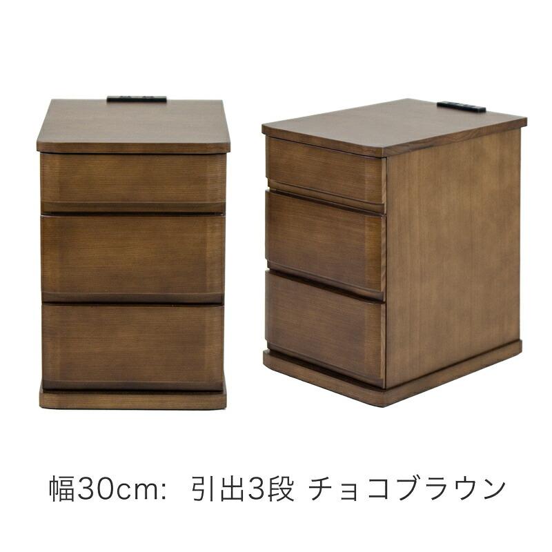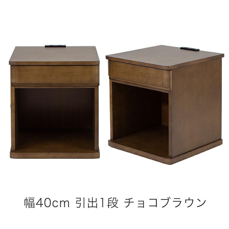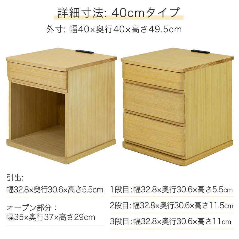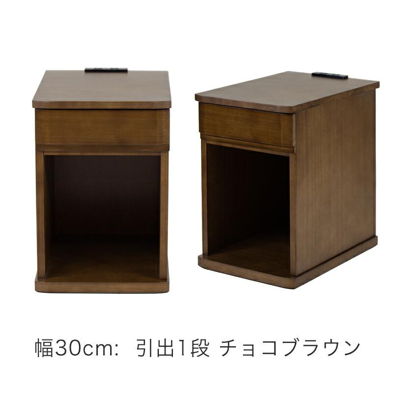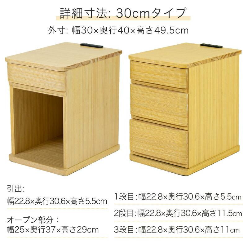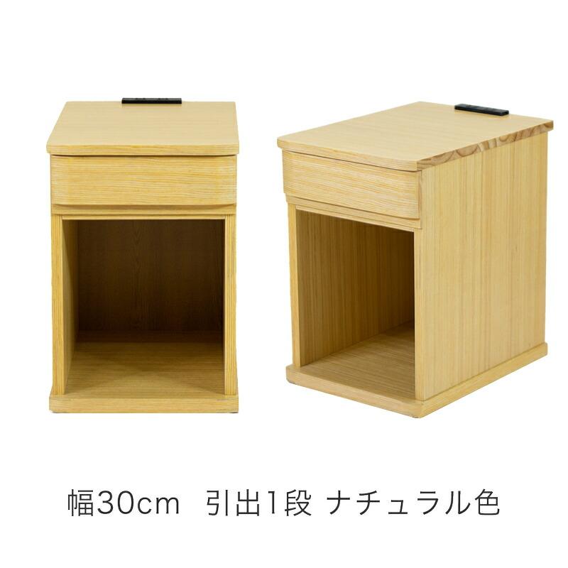 様々なバリエーションから選べるナイトテーブル・ベッドサイドテーブルです。幅は30cm、40cmから、引き出し1杯、3杯、3色展開で、どんなお部屋にもぴったり合うデザインです。 天板と引出の前板はタモ材で綺麗に仕上げてあります。オープンスペース部分も十分広いため、ゴミ箱収納・ブックスタンドとしてもお使いいただけます。小物入れに便利な引出しには筆記具や日記、薬入れ(ピルケース)やメガネ、天板はリモコンや目覚まし時計、フォトスタンド、スマートフォンや文庫本を置いておくのに便利です。完成品ですので、組み立てる必要がなく、開梱してすぐにお使いいただけます。コンセント付なので、携帯・スマートフォンの充電、時計や読書灯・ランプにも使え便利です。