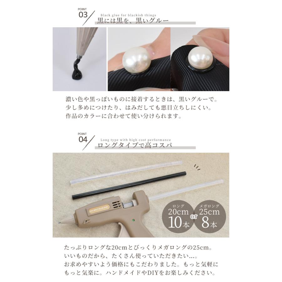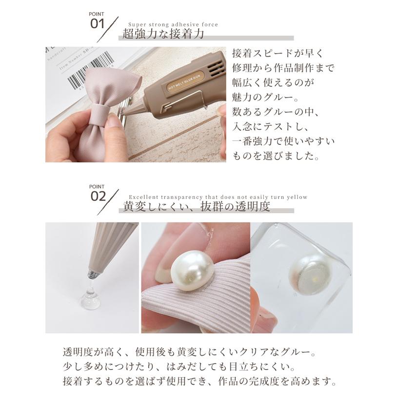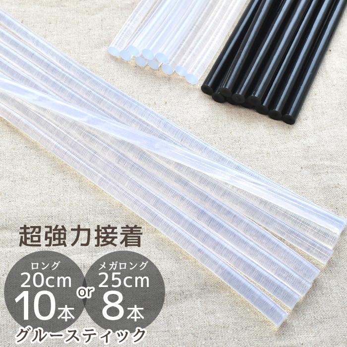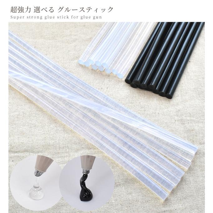 超強力 選べるグルー スティック#ゆうパケ11点可数あるグルーの中から入念にテストし、一番接着力があるものを選びました。接着力だけだなく、透明度が高く作品の邪魔にならないクリアなグルーと黒っぽいものを接着したときに目立たない黒いグルーをご用意。長さもたっぷりロングサイズ。通常よく見かけるグルースティックは約10cmですが、こちらは2倍以上の長さ!ハンドメイドやDIYをもっと身近に、もっと手軽に。楽しんでいただけるようお値段にもこだわりました。
