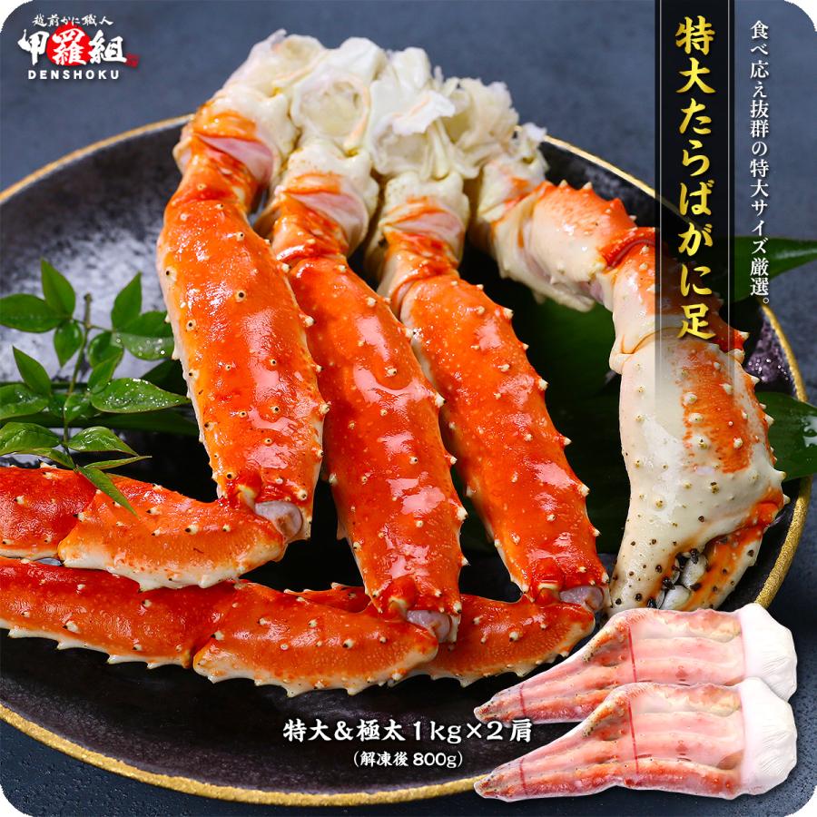 商品内容:特大ボイルたらばがに足1kg(解凍後800g前後)×2肩 ※ロシア/オホーツク海産賞味期限:冷凍−18℃以下で1ヶ月。自然解凍後は冷蔵保存にて2日中にお召し上がりください。お召し上がり方:カニについているグレース(氷の膜)を流水で洗い流し、自然解凍してお召し上がりください。塩ゆでしてありますので、そのままでも美味しいですが、ホットプレートやフライパンで焼いても甘味が増して美味しいです。電子レンジや熱湯での解凍をすると風味が損なわれます。配送について:送料無料