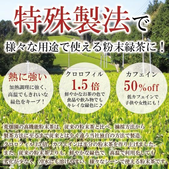 粉末茶はたくさん出回っていますが、荒畑園の「高機能粉末茶」は採取方法から栽培方法まで従来とはまったく違った特殊製法で作り上げいます。