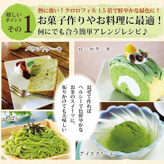 熱に強い粉末緑茶なので色も変わらずきれいなグリーンが楽しめます。お料理やお菓子作りにぜひご利用ください。