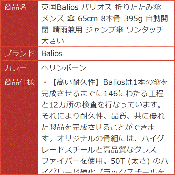 ・「高い耐久性」Baliosは1本の傘を完成させるまでに146にわたる工程と12カ所の検査を行なっています。