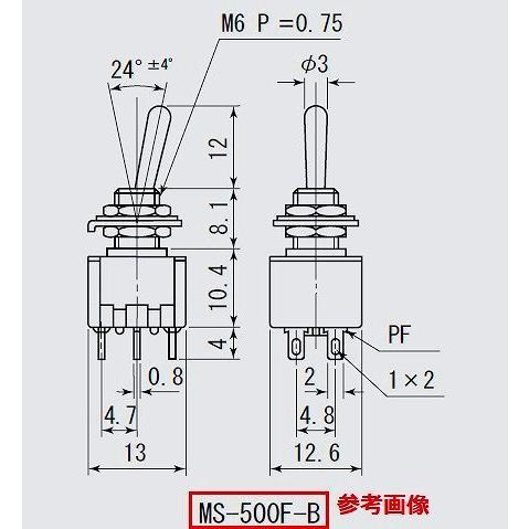 型番:MS500GB回路:DPDT(6P)スイッチ特性:ON-(ON)レバー倒れ角度:20°±4°端子形状:半田端子操作形状:バット状レバー電流容量:6A.125V.AC絶縁抵抗:DC.500V 100MΩ以上(MIN)絶縁耐圧:【端子間】AC.1000V 1分間(Minute) 【充電部と非充電部】AC.1500V 1分間(Minute)接触抵抗:20mΩ以下(MAX)