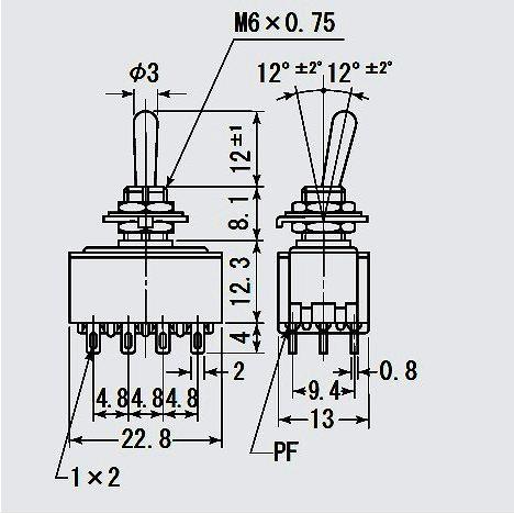 型番:MS500RB回路:4PDT(12P)スイッチ特性:ON-OFF-ONレバー倒れ角度:12°±2°端子形状:半田端子操作形状:バット状レバー電流容量:6A.125V.AC絶縁抵抗:DC.500V 100MΩ以上(MIN)絶縁耐圧:【端子間】AC.1000V 1分間(Minute) 【充電部と非充電部】AC.1500V 1分間(Minute)接触抵抗:20mΩ以下(MAX)