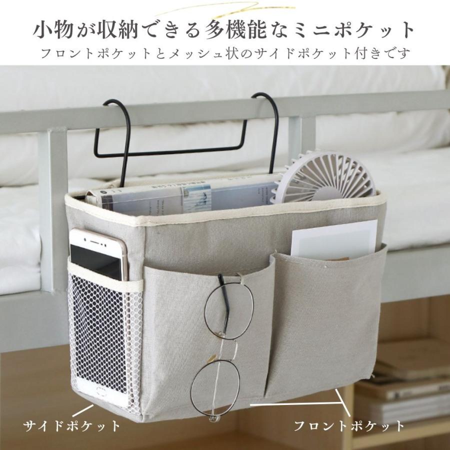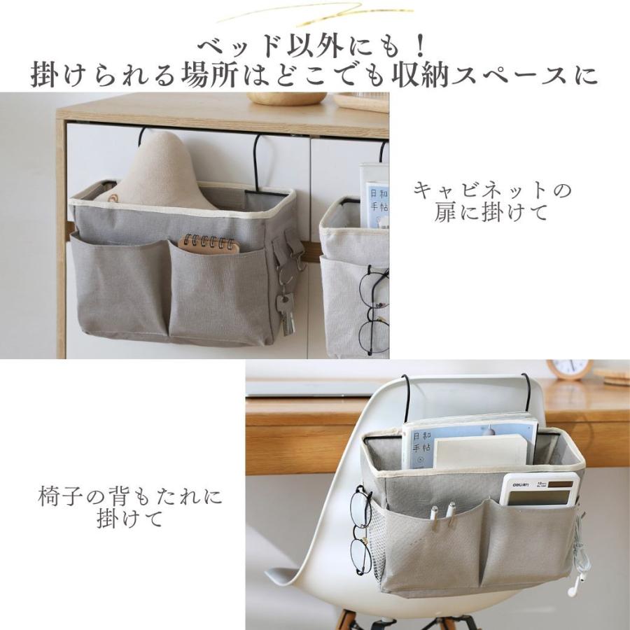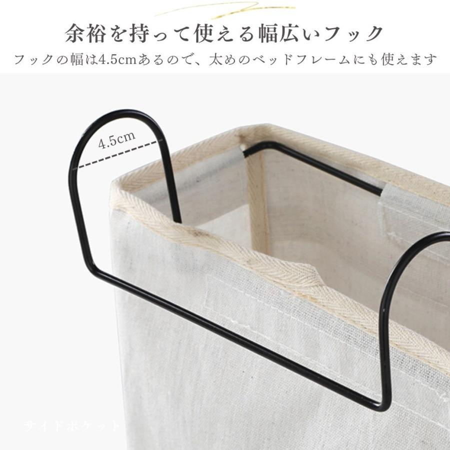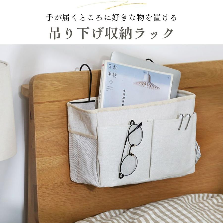 ・特徴:ベッドサイドに吊り下げるおしゃれな収納ラック。リネンの生地にスチールのフレームをつけることでお部屋に馴染み落ち着いたインテリアになります。引っ掛けるだけで設置できるので、家具を傷つける心配もありません。