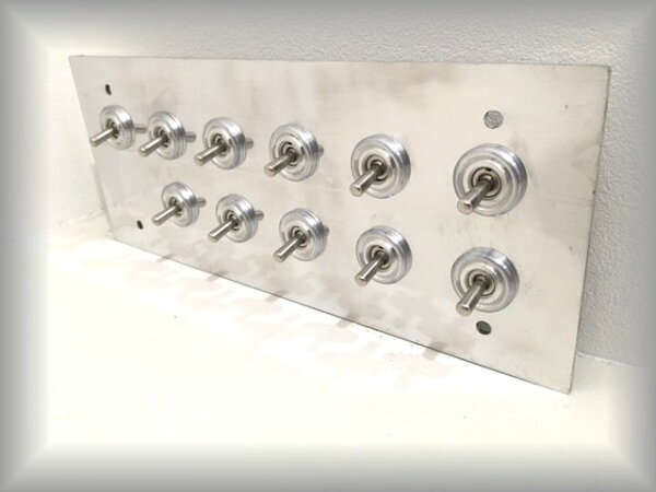 憧れのレバー操作。超お買い得価格!例画像のように擦り傷や成型傷があります。現物の傷ではありませんので参考までの傷をお考え下さい。見たことはあるけど、なかなか手にすることのないこの形。憧れのトグルスイッチ シルバー普段、何気なくつけるあかりを、トグルの視覚的な効果・ON-OFF切り替えのパチッとした確かな手応えにより、電気を使うことを意識的に感じさせます。サイズ:約30cm×約12cmアルミ製 ビス付属 新品ですが画像にように色ムラや汚れ、擦り傷、スレなどありますのであらかじめご了承下さい。 ・一般住宅照明器具推奨・通常onoffの片切 階段等の三路回路スイッチに使用できます。 取付けの際は、お近くの電気技師へご依頼ください。スイッチの配置ですが縦1つのスイッチが左右反対上になる場合がございますのでご了承ください。