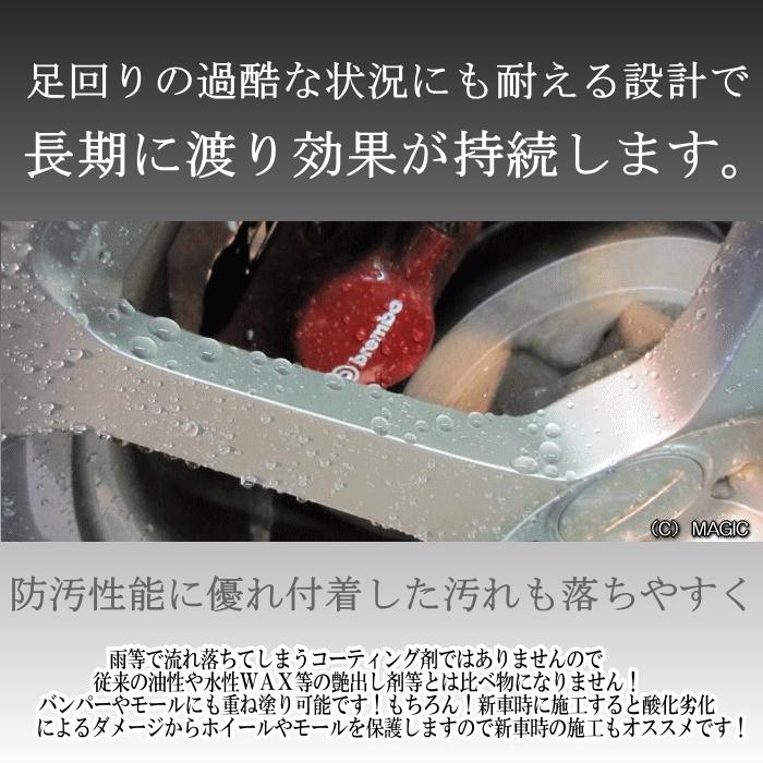 アルミホイール&樹脂モール専用SiO2ガラス被膜コーティング剤はプロ専用品ですのでカーショップや量販店では決して手に入れる事のできない商品です。「SG-W」の硬質皮膜は完全無機質な正真正銘『本物』のSiO2ガラス被膜を形成しますので大切なお車のアルミホイール&樹脂モールを長期に渡り保護します。
