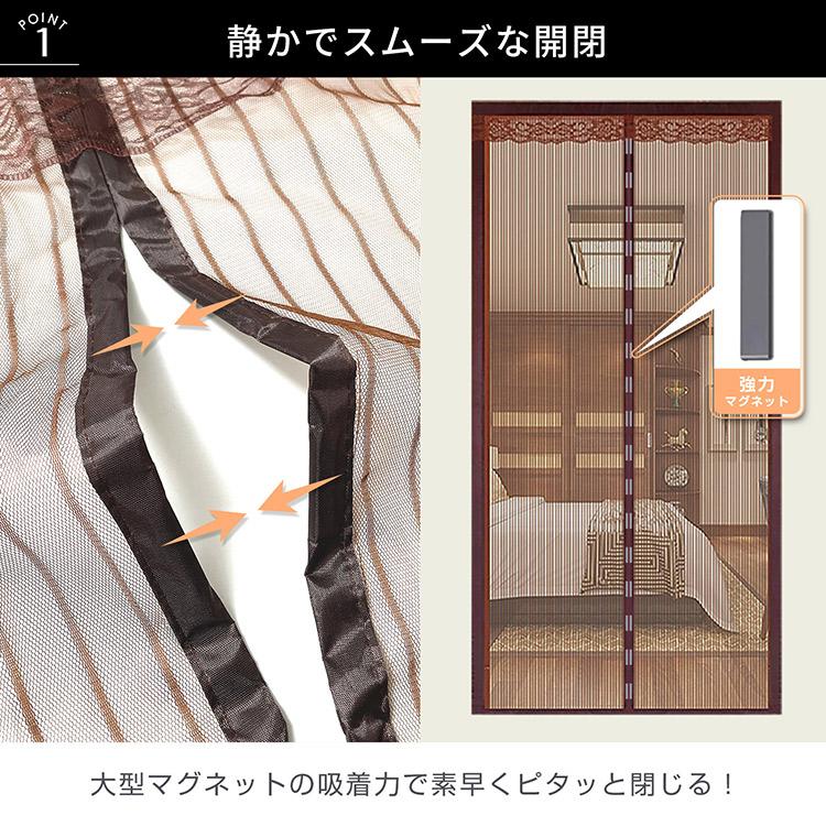 ■害虫の侵入を防ぐ網戸です■マグネットと磁石で開口後ぴたっと閉じます■玄関・リビング・お部屋などの設置がおすすめ【商品内容】:網戸カーテン【サイズ】:210cm×92.5cm【カラー】:ブラウン/ベージュ【使用上の注意事項】※仕様は改善の為に予告なく変更する場合があります。 ※ディスプレイ画面等の環境上、写真と実際の商品の色とは多少違う場合がございます。※海外輸入商品により、汚れ/ダメージ等がついている場合がございます。