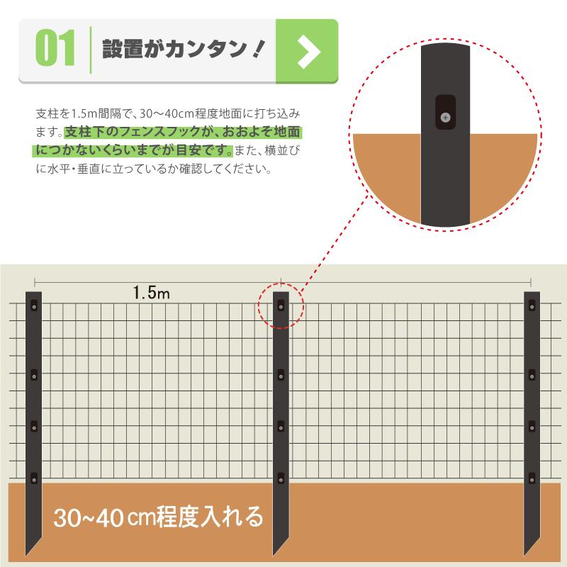 シンプルなデザインなので景観を損ねず、害獣対策・ドッグラン・ガーデニング・太陽光発電のフェンスなどに 使用できます。