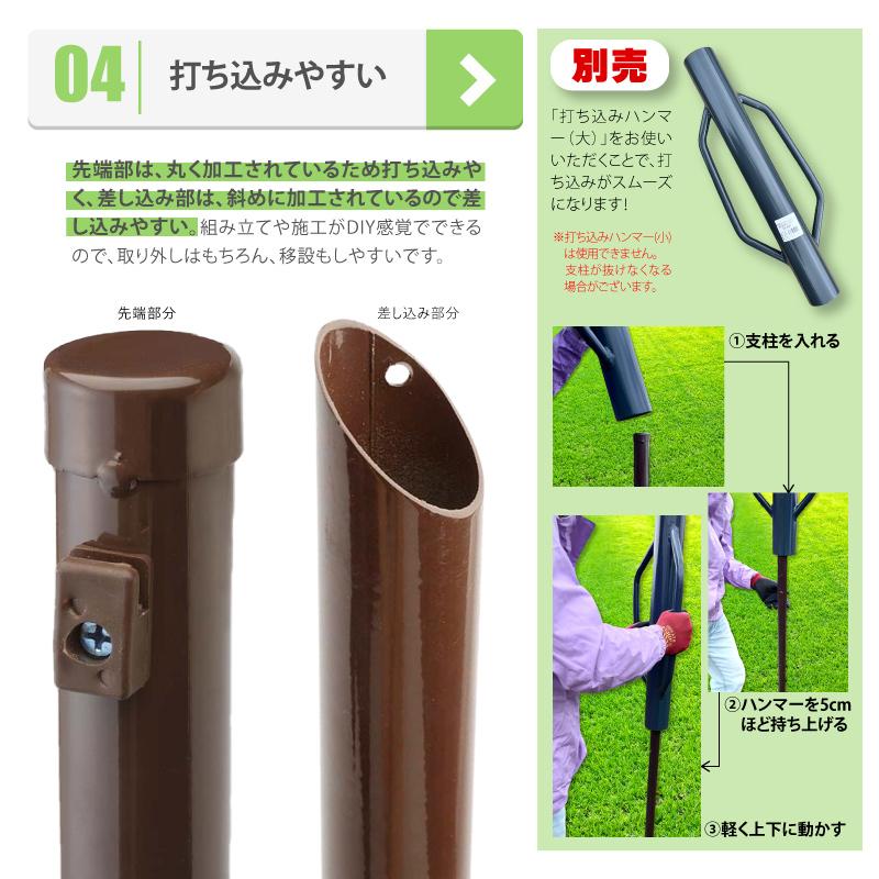 プラスワイズ オリジナル の アニマルフェンス ブラウン は、通常の アニマルフェンス グリーンと比較すると先端部が丸く加工している為、 打ち込みやすく作業時間が短縮できます。また、PVCコートワイヤーを使用しているので、丈夫でさびにくく、長持ちします。