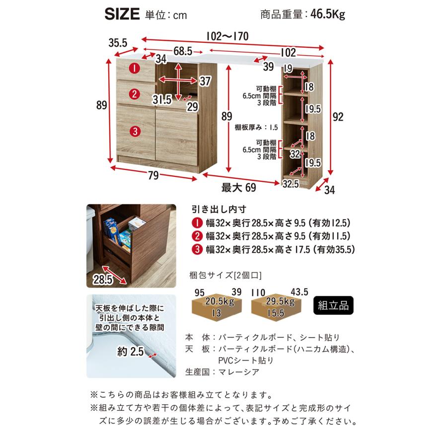 全体:W102〜170 x D39 x H92cm