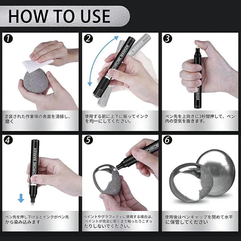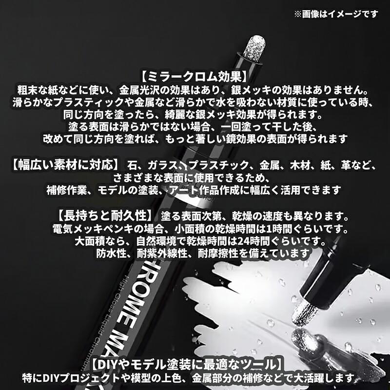 滑らかなプラスティックや金属など滑らかで水を吸わない材質に使っている時、同じ方向を塗ったら、綺麗な銀メッキ効果が得られます。塗る表面は滑らかではない場合、一回塗って干した後、改めて同じ方向を塗れば、もっと著しい鏡効果の表面が得られます