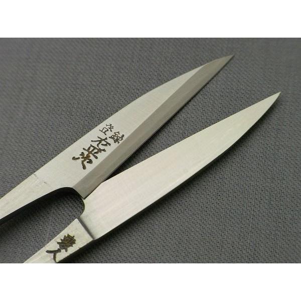 【刃】・・・最高級鋼に軟鉄を鍛接し、研ぎあげた本格にぎりはさみ、プロ仕様。同じ先細タイプのししゅう型に比べ刃幅が大きいので、しっかり感があります。