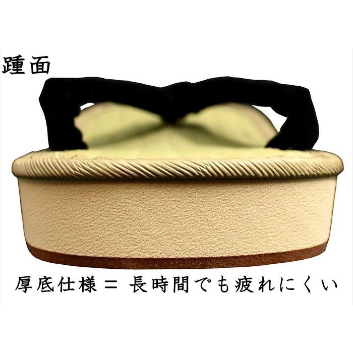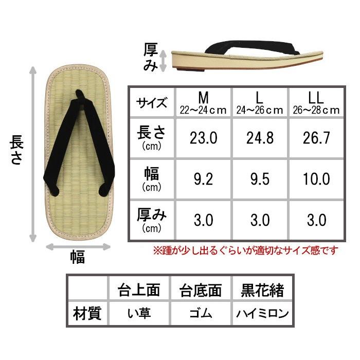 お気軽に雪駄感覚を楽しめる軽装雪駄です。本物の雪駄は表が竹皮の畳表、裏が牛革底ですが、こちらの軽装雪駄は表が井草の畳表、裏がアメ底になっています。ビニールではなく井草の畳表なので、足当たりが気持ち良いのが特徴です。アメ底になっていますので、滑らず水にも強くなっています。花緒は起毛素材の化学繊維「ハイミロン」を使用したシンプルな黒無地がすがっています。素足でも足袋でも、御普段着に合わせてお履き下さい。