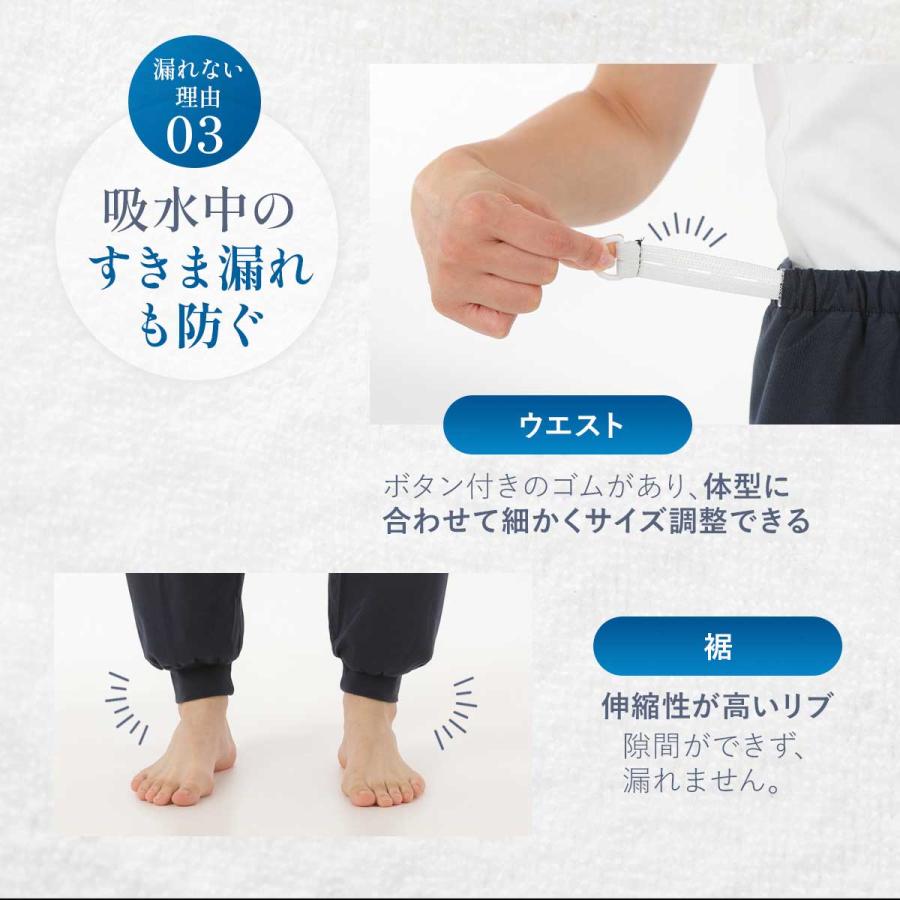 【 ウエスト調整が可能 】ウエスト部分はボタンホール付きゴムで調整が可能です。しっかりフィットし動いてもズレにくいので、ウエスト部分からの尿漏れも防ぎます。