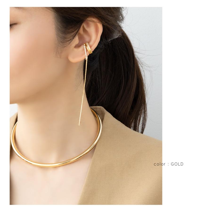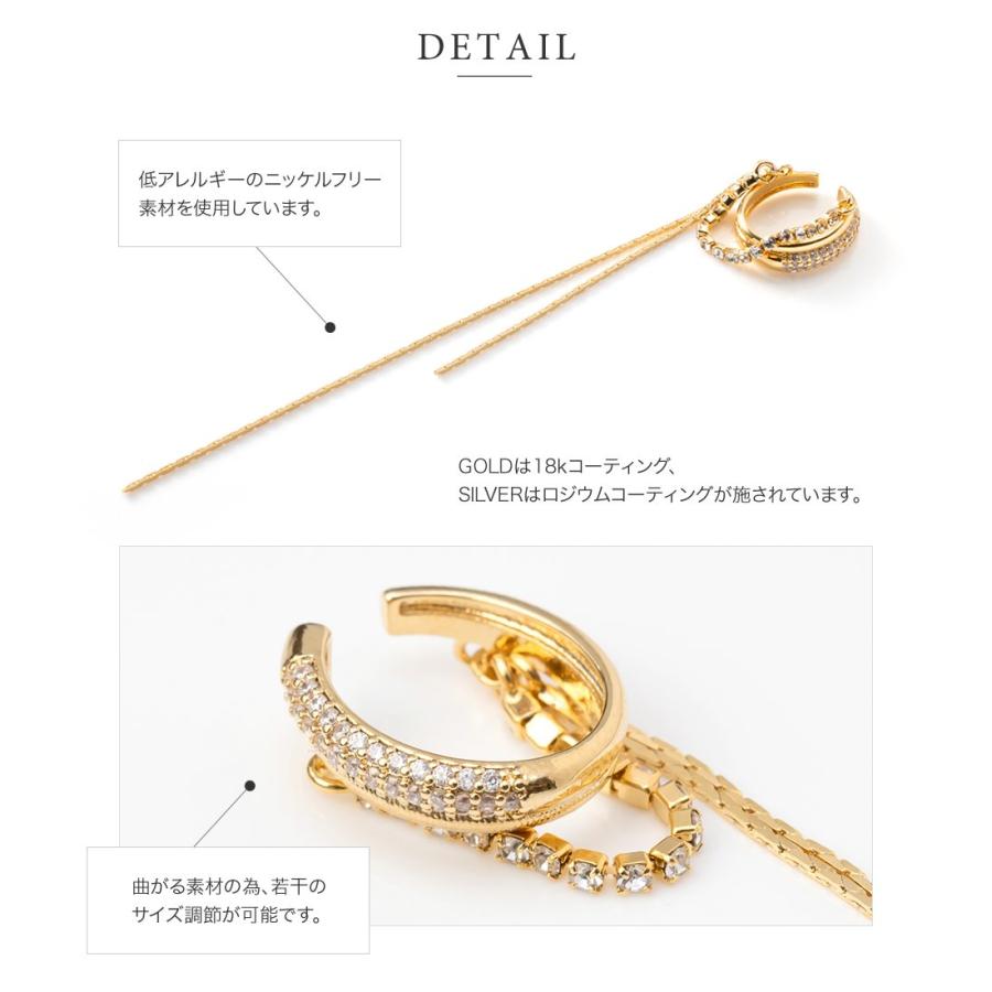 ロングスエッジチェーンが軽やかに揺れる片耳用イヤーカフ。煌く小粒ビジューを飾ったモチーフで品よく身につけられます。レイヤードしているように見える技ありデザインで周りと差のつくアイテム◎