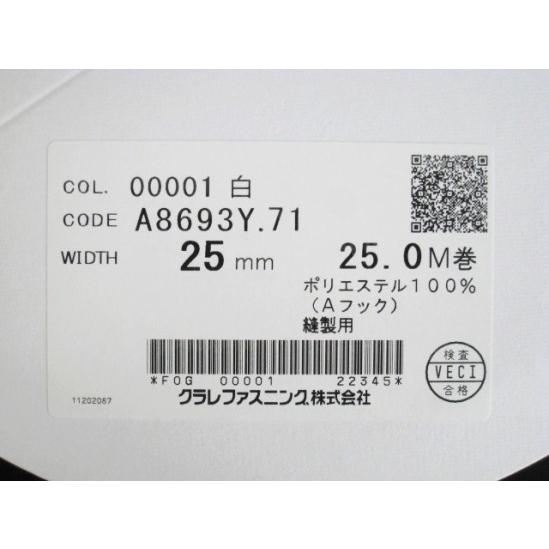 クラレ製ニューエコマジックテープ。ポリエステル製(品番:A8693Y−71)のフックタイプです。A面(オス)のフックタイプ材質:ポリエステルカラー:白サイズ:幅:25mm(有効幅:21mm) 25m巻※25mの中で複数継ぎ目がある物がございます。継ぎ目の場所は一定ではございません。最大で3ケ所までがメーカー規格となっております。ご了承下さい。サイズはあくまでも目安であり、商品により多少の誤差が出ます。なお、商品の仕様は予告なく変更する場合がございます。ご了承下さい。