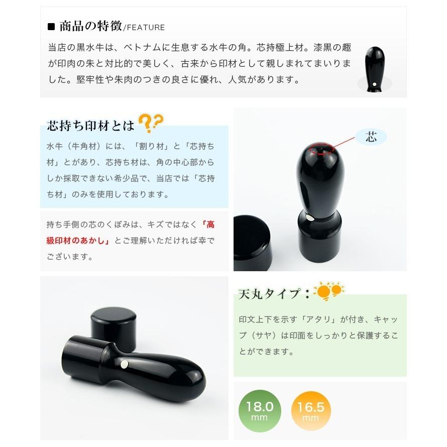 黒水牛:漆黒の趣が印肉の朱と対比的で美しく、古来から印材として親しまれてまいりました。堅牢性や朱肉のつきの良さに優れ、人気があります。