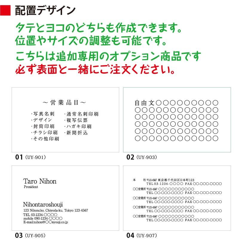 下記は概要です。必ず【 詳細な説明 】をご確認の上でご注文くださいませ。●内容 : こちらは名刺の裏面にモノクロ印刷を追加するオプション商品です。必ず表面と同時にご注文ください。●印字項目 : 印字したい項目に入力ください。●その他 : 同時購入の表面に準じます。