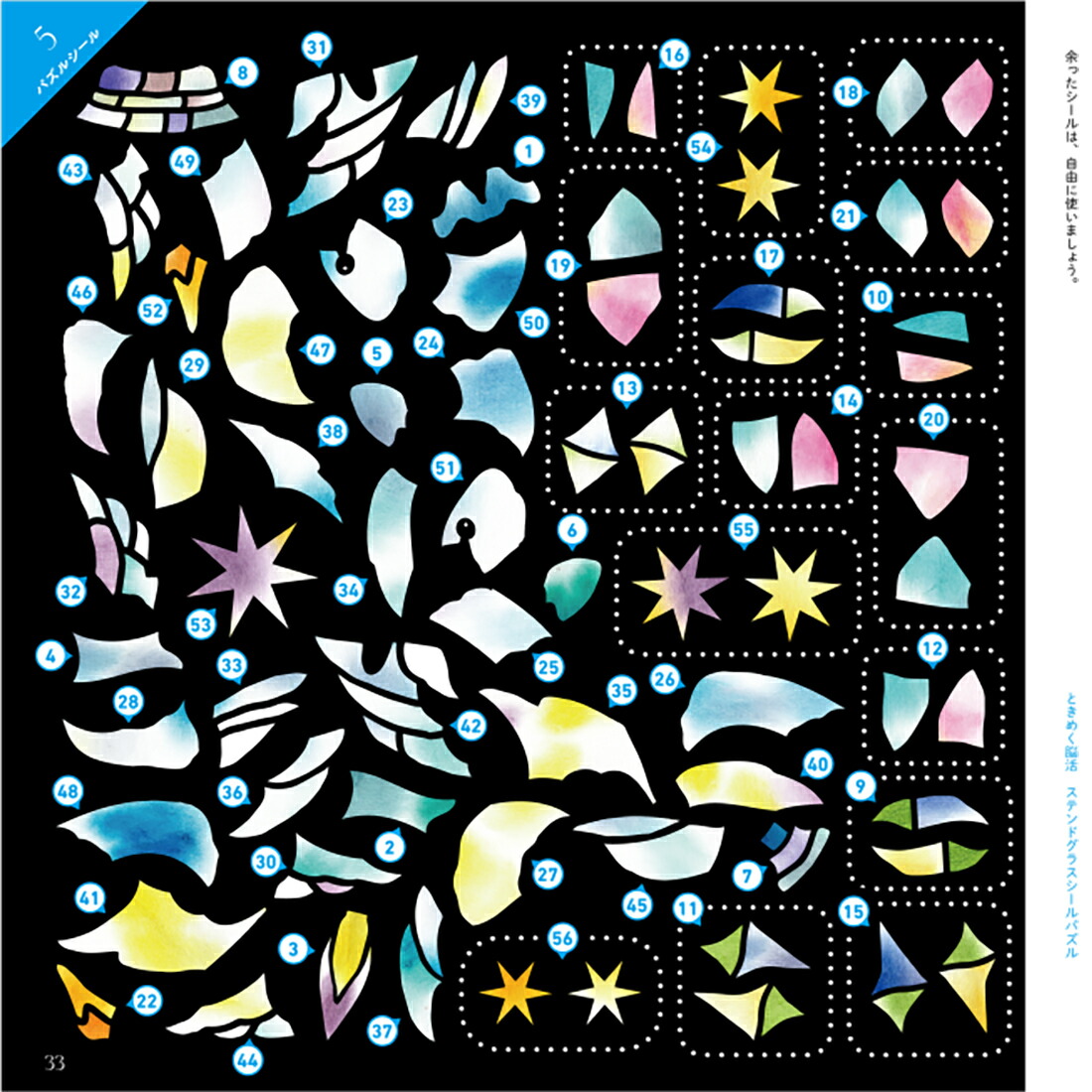 ゜*.。.*゜*.。.*゜*.。.*゜*.。.*゜*.。.*゜*.。.*「ときめき」で脳機能活性化&ストレス低減!美しいイラストがつくれる、新感覚シールパズル゜*.。.*゜*.。.*゜*.。.*゜*.。.*゜*.。.*゜*.。.*真っ黒な背景に、色彩豊かなシールを貼って、「ときめく」イラストを完成させよう!【監修 京都大学名誉教授・積山薫】新しいことにワクワクしたり、美しいなと思ったりする気持ち≒「ときめき」は、脳と心にさまざまな変化を引き起こすことが報告されています。「ときめき」は、脳機能を活性化させ、ネガティブ感情を低減させることで、高齢期には認知機能維持にもつながる可能性があります。本書は、美しい色のシールを貼って、素敵なイラストを完成させるシールパズルです。シールの色を選んだり、配置を考えたりしながら、11作品を通して「ときめく」ことができるでしょう。【絵 大人気切り絵作家・大橋忍】言葉や音をヒントに、画用紙と手染めの和紙を用いて切り絵を制作。個展開催やイベント出展のほか、全国の寺社の切り絵御朱印のデザインを担当。【道具いらず!】パズルの取り組み方(1)台紙とパズルシールを準備します。それぞれ、ミシン目で切り離せます。(2)同じ数字のシールを探します。シールはランダムに並んでいるので、台紙の枠の中にある数字と同じ数字のものを探しましょう。(3)枠にあわせて、シールを貼ります。シールの向きも考えて貼りましょう。(4)完成!ステンドグラス風の鮮やかなイラストができあがります。同じ形のピースが並ぶ易しい問題から、ピースの細かい難しい問題まであります。その日の気分にあわせて、好きなレベル・絵柄を選びましょう。【自分なりのアレンジもできる】同じ形のシールは、好きな色を自由に選んでOK!色違いのシールもあるので、自分なりのアレンジができます。【パズルが完成したら】(1)「かざりシール」を使って、デコレーションしましょう。(2)ミシン目で切り取って、おうちの壁などに飾るのもおすすめです。