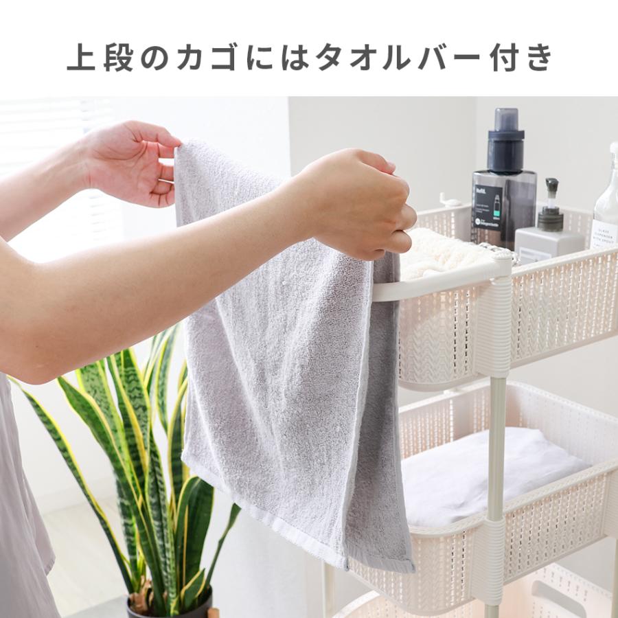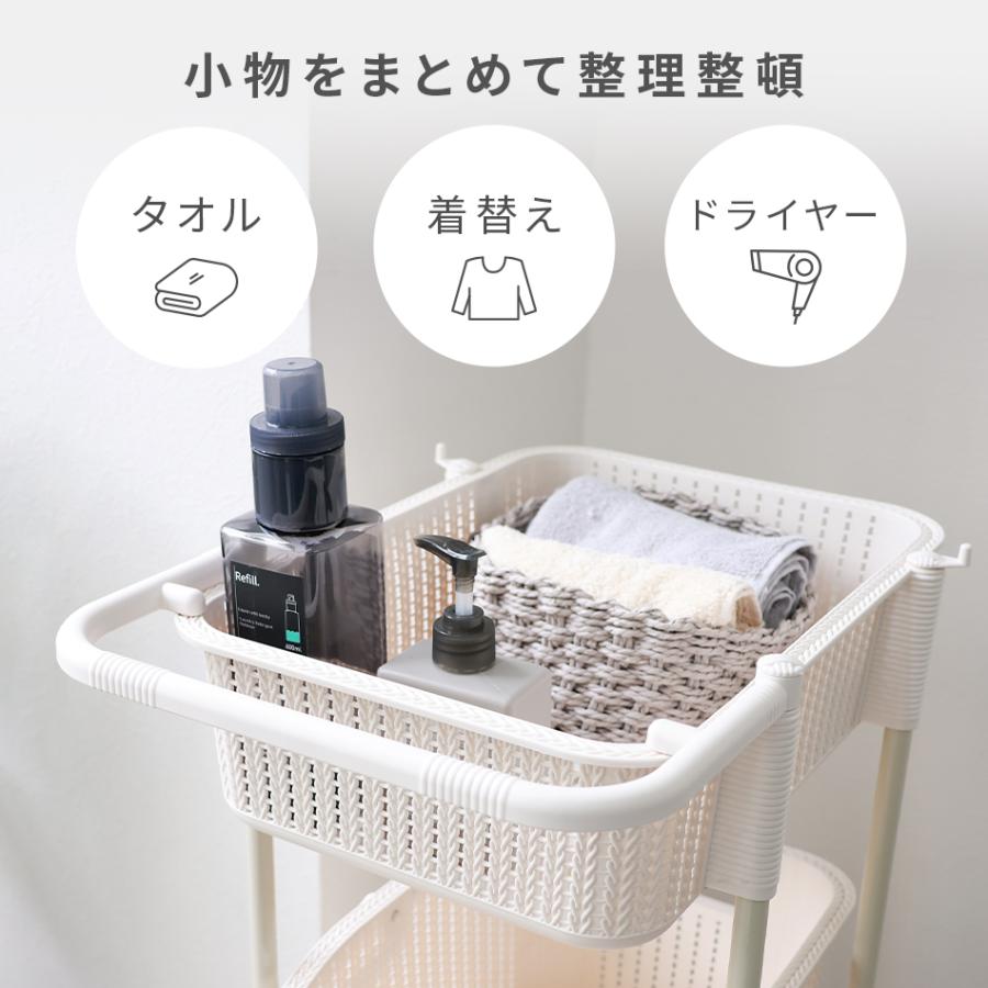 上段の浅バスケットにはバス用品、洗濯機まわりの小物が収納できます。