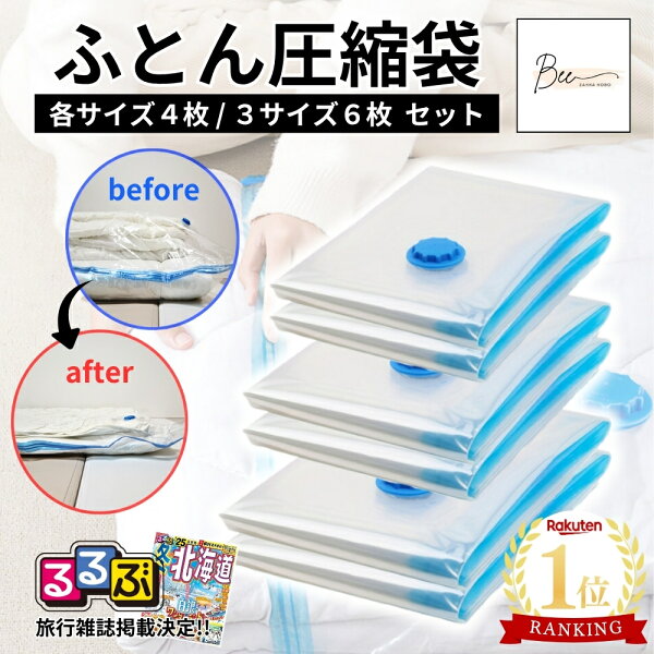 【商品仕様】ふとん一式、掛布団、敷布団、こたつ布団、敷パッド、毛布、バスタオル、衣類、洋服、ぬいぐるみなど様々なものを圧縮して収納できます。押し入れや棚の整理、衣替え、旅行、引っ越し、荷造りに最適な商品です。【簡単圧縮】空気栓(バルブ)の蓋を外して、圧縮袋を折りたたんで押し出したり、掃除機で簡単に空気を抜くことができます。日本国内のほとんどの掃除機に対応しており、掃除機で吸引するほうが素早く、より圧縮することができます。【逆流防止】空気栓(バルブ)はオートバルブを採用し、空気が逆流しない設計になっております。袋の中の空気を排気するだけで簡単に圧縮できます。【品質・保管】素材:PA+PE、厚み:60→75ミクロンに改良しました。厚みを上げているので、柔らかく破れにくいので長期保管・再利用可能です。防水・防臭・防カビ・防虫・防塵効果があるので、大事な洋服やシーズンが過ぎた布団を大切に保管できます。【保証付き】弊社の製品はお買い上日より30日以内に商品品質の問題がありましたら、返品あるいは返金対応いたします。24時間以内返信致しますので、何かご質問がありましたらメールでご連絡して下さい。