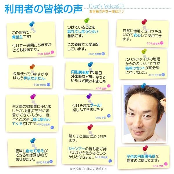 水に濡れても固定力が落ちないシリコン粘着シールなので、装着したままでシャンプーもOK、髪の毛は人毛と耐熱人工毛のミックスなのでドライヤーでセット出来ます。1〜2週間の連続装着も可能です。(※装着期間は使用される方の体質、使用環境などにより異なります)