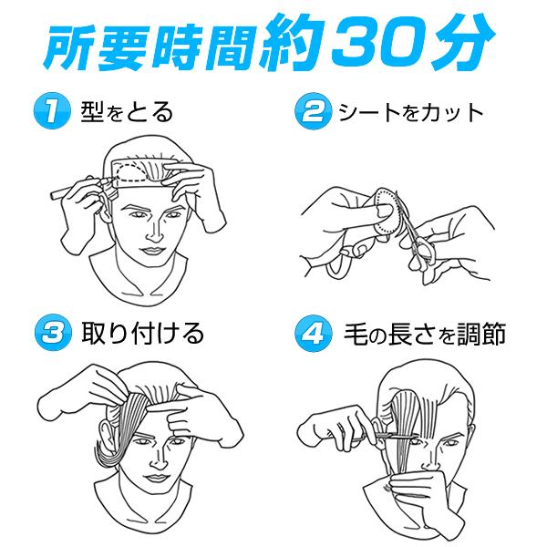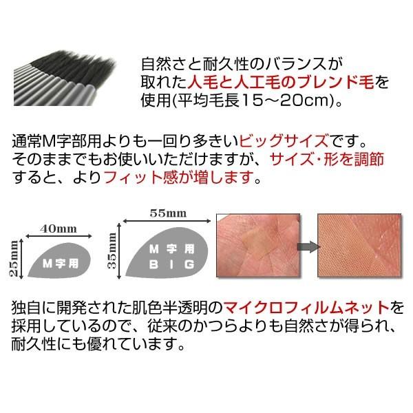 また、広範囲への装着という事と、自毛部分との馴染み方を考慮した末、通常のM字部用に比べて毛量(毛の密度)を若干少なめに設定していますので、増毛部分だけ髪の毛の密度が高すぎて不自然になったりはしません。