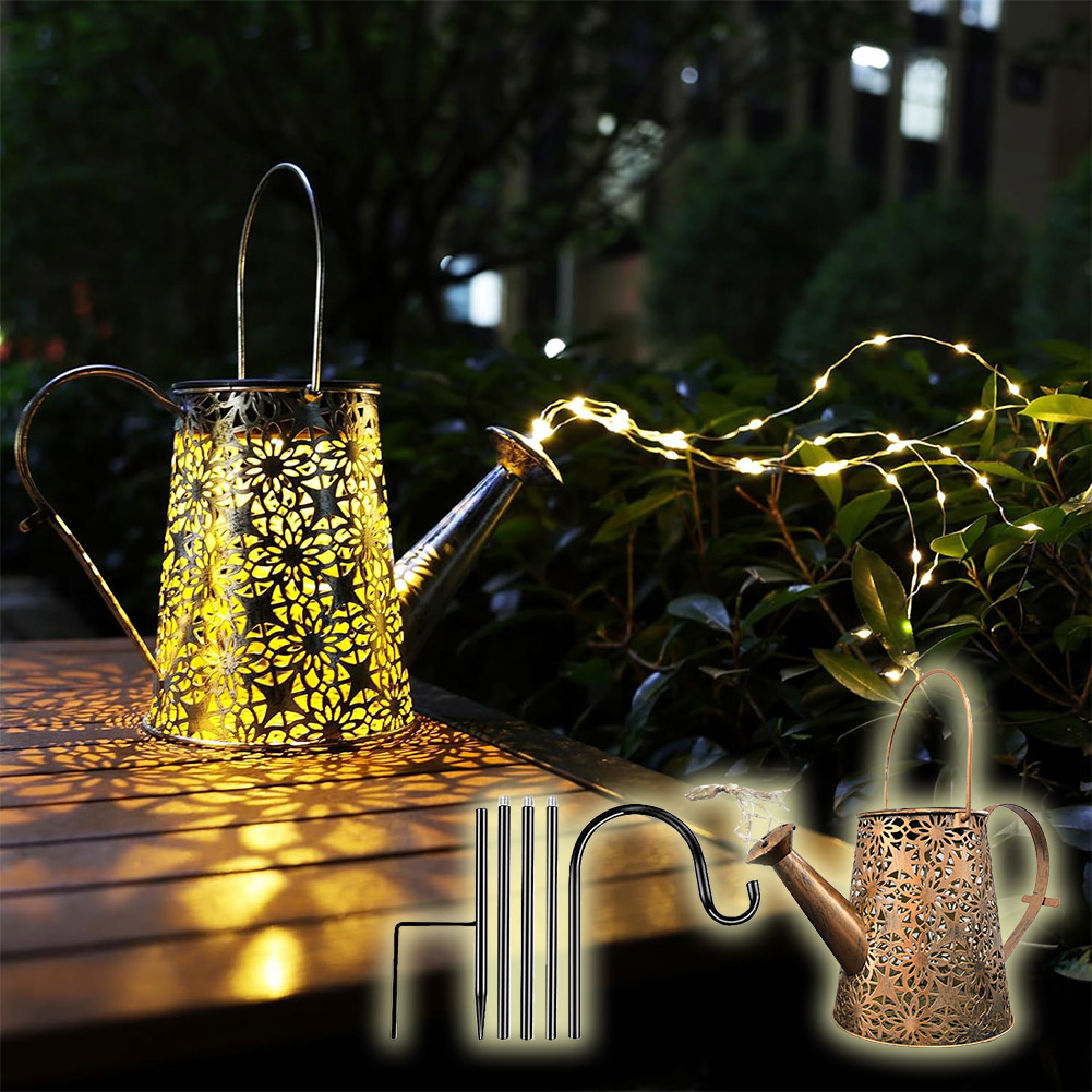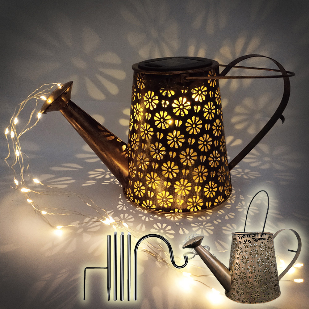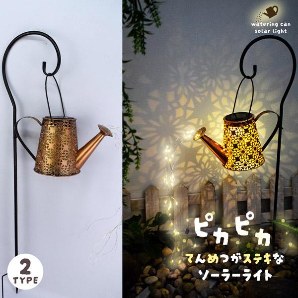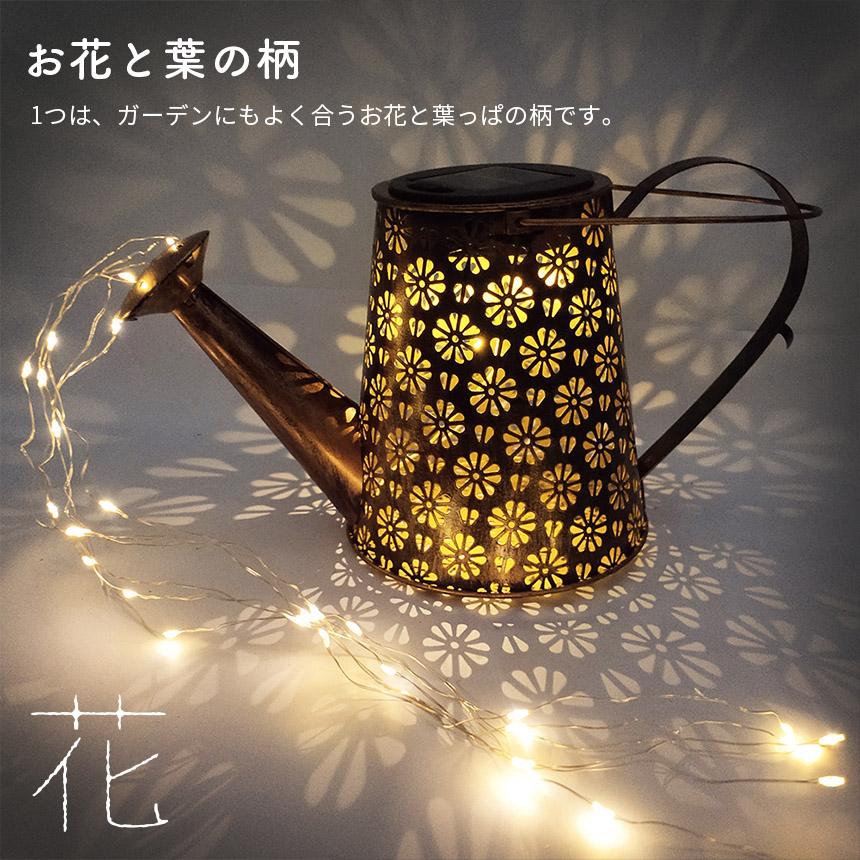 ●2つの柄を選べるじょうろ型ソーラーガーデンライト【ガーデンライト】お洒落な装飾ガーデンライト:じょうろが輝く星の流れを注いでいるかのよう。暖かい白色LEDが繊細な銅線に張られ、ピカピカと交互に点滅。ずっと見ていられるような光景を作ってくれます。風がふけば、魔法のような美しくロマンチックな雰囲気を作り出し、お庭を華やかにします。